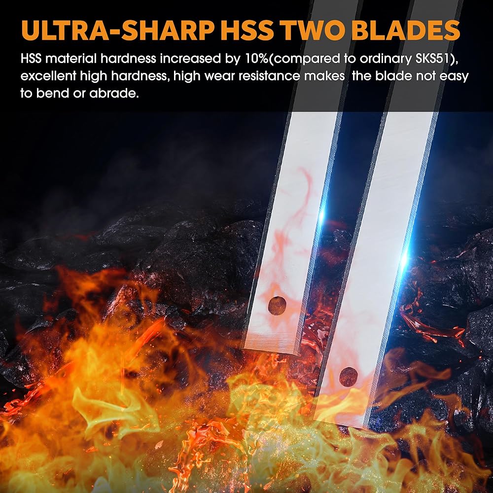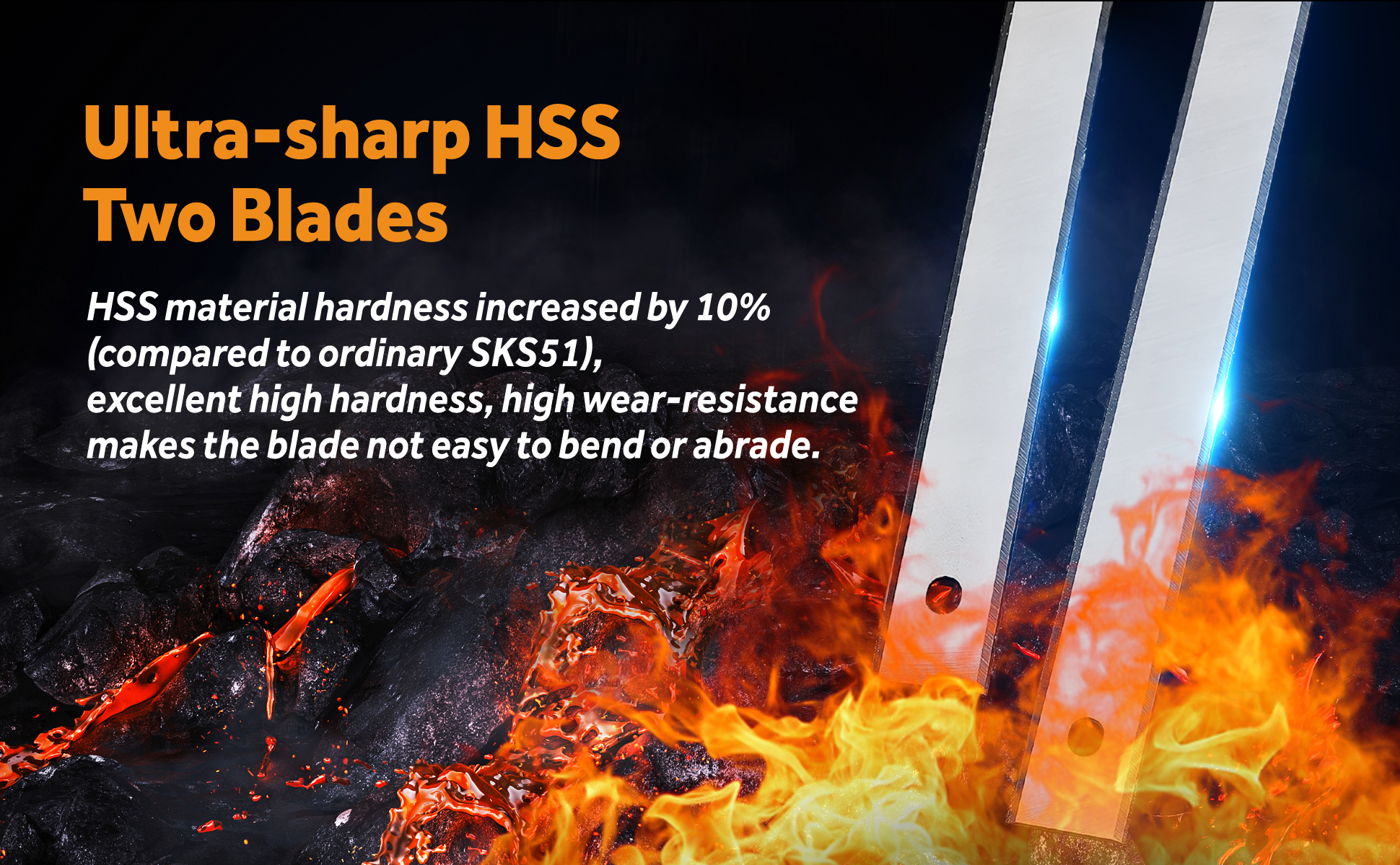 【Ultra-sharp HSS Double Blades】Kayrain benchtop thickness planer upgrades the ordinary SKS51 to HSS material, which makes the hardness of the blade breakthrough 10% higher, excellent high hardness, high wear resistance makes the blade not easy to be bent or worn out, and the service life is greatly improved