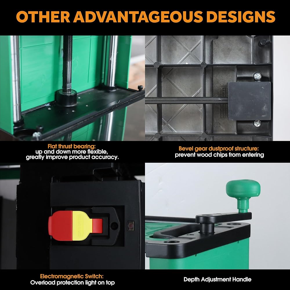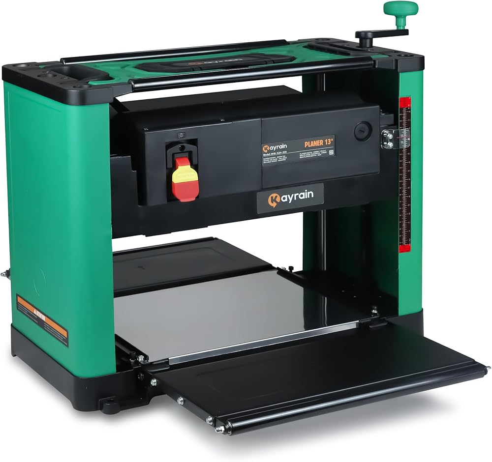 【Millimeter Precision Cutting】The upgraded lead screw system allows millimeter adjustments for planing up to 13IN wide and 0.12IN deep, with a side-to-side tolerance of 0.008IN. Kayrain thickness planers woodworking precision design allows for a more stable planing process while avoiding unevenness in the cut piece (planer board thickness range: 0.24IN - 6.3IN)