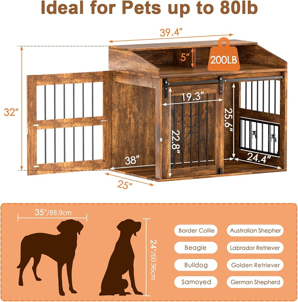 Large Dog Crate Furniture, 40" Heavy Duty Dog Crate with Sliding Barn Door, Dog Kennel Furniture Style House, Wooden Decorative Pet House End Side Table, Chew-Resistant, Rustic