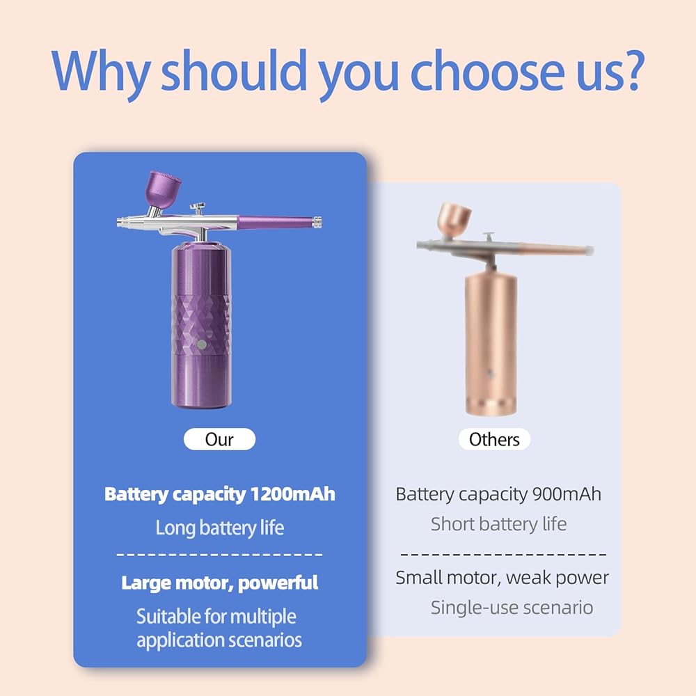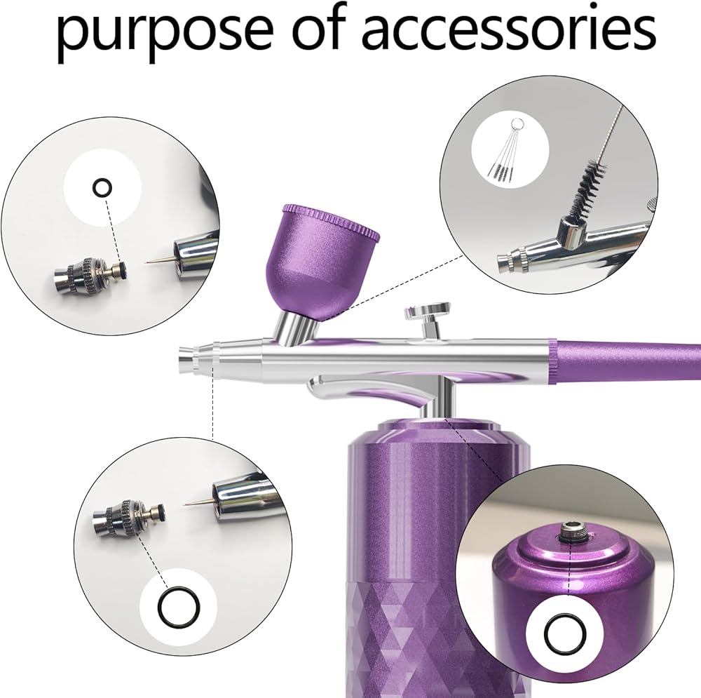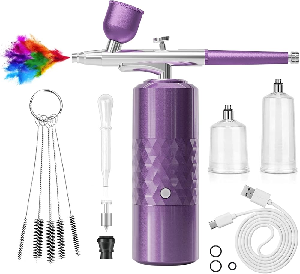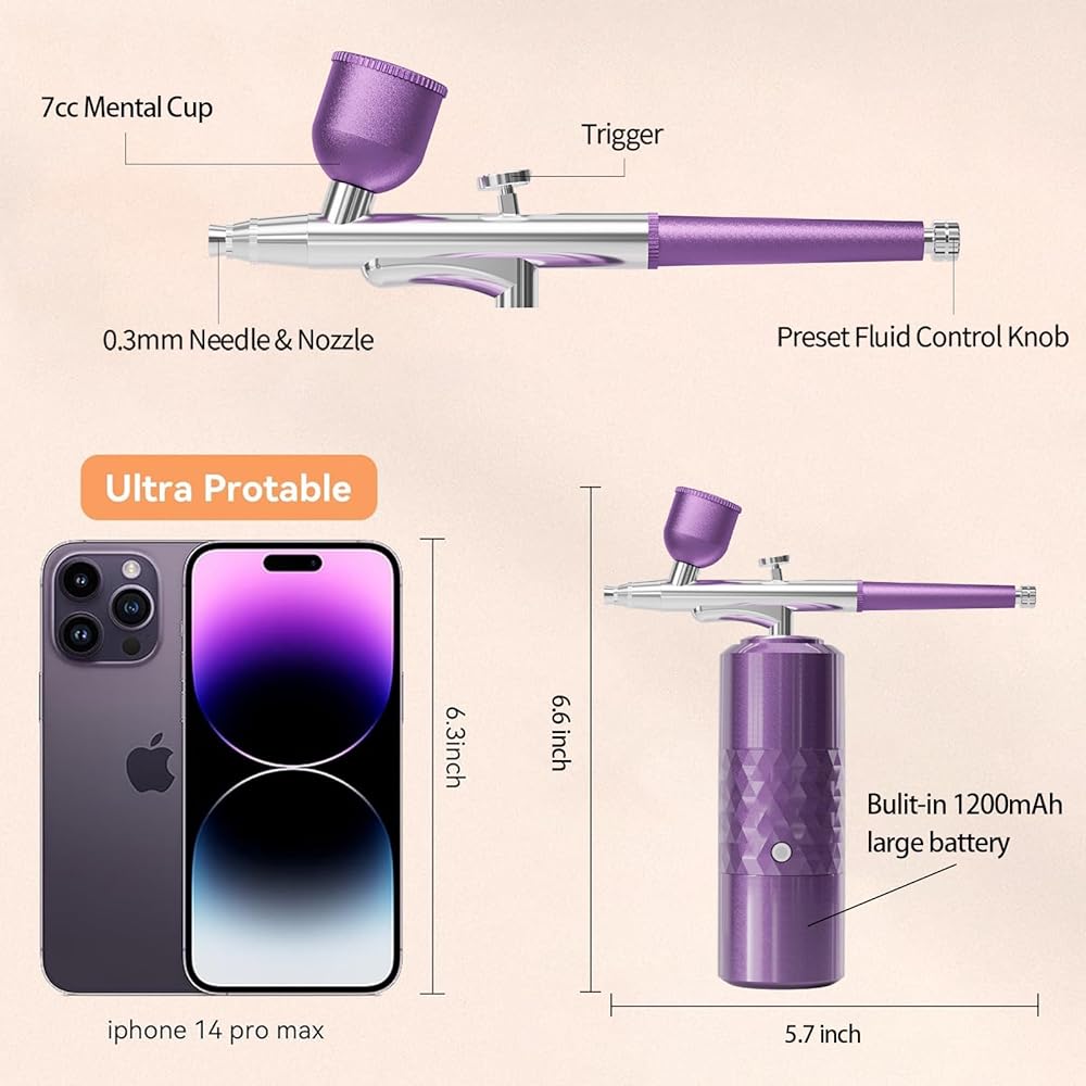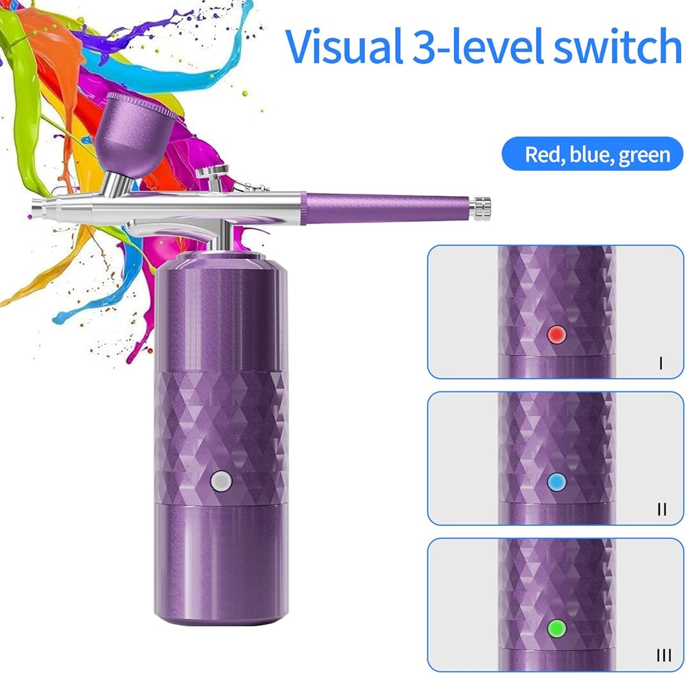 【Newest Versatile Airbrush Kit】 With this cordless airbrush kit and its adjustable pressure, you can achieve a variety of effects on any surface. It allows for creating complex fine lines and large area paintings, such as nail art, airbrush makeup, model coloring, hair dye, tattoos, cake decorations, doodles, illustrations and any DIY paint.