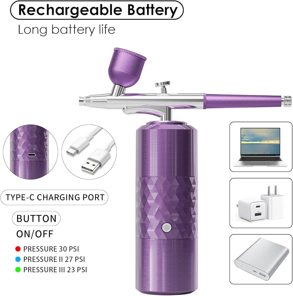 【Easy to Use】 This cordless airbrush does not have a tangled cable! You can use this wireless airbrush practically anywhere. The airbrush compressor battery can operate continuously for an extended period and supports USB interface charging, such as from a power pack, adapter, laptop, power board, etc. Note: It is recommended to use a 5V/1A or 5V/2A adapter. Do not use adapters with a higher output than 5V 2A.