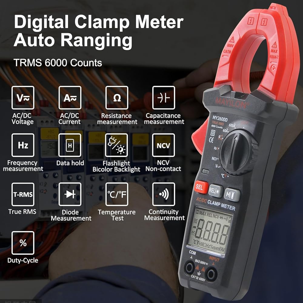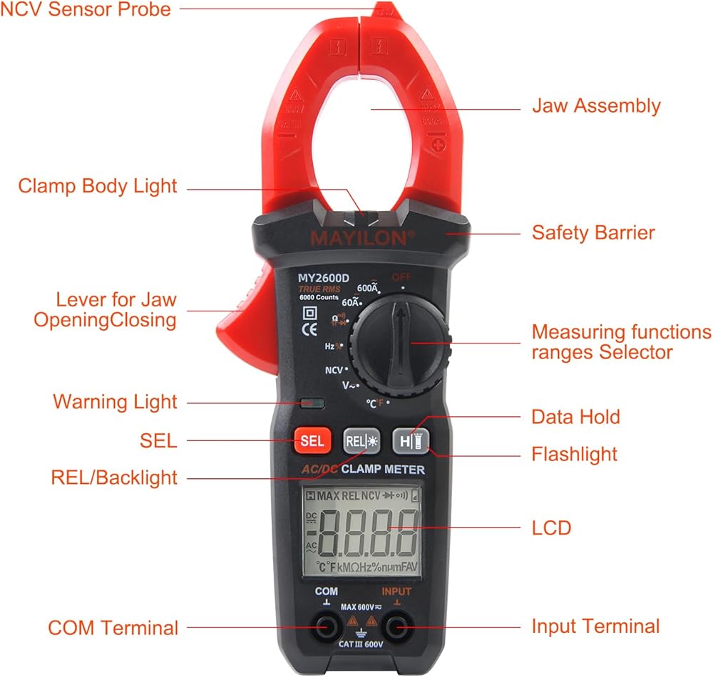 True-RMS AC/DC Clamp Meter: Amp meter can accurately measure 600A AC/DC current, 600V AC/DC voltage, frequency, capacitance, resistance, temperature, diode, continuity, NCV etc. It is a perfect troubleshooting ammeter tool, perfect for home and professional use, automotive, home and industrial electrical troubleshooting.