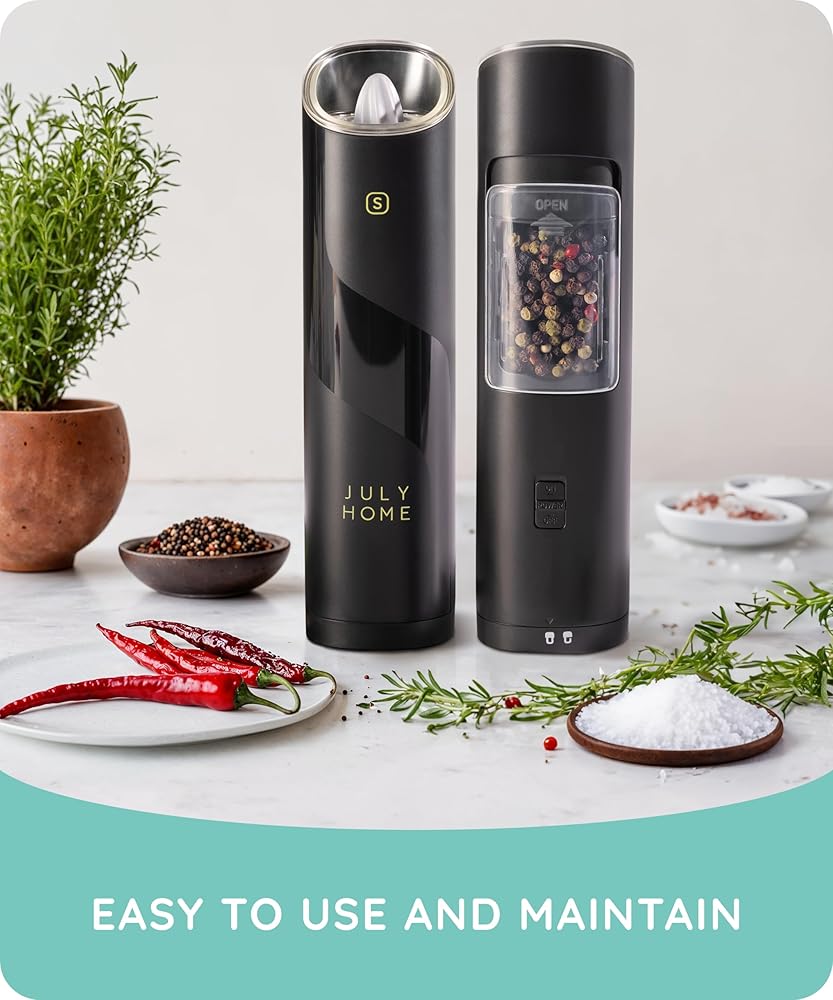 Gravity Electric Salt and Pepper Grinder Set of 2, Battery Operated, Adjustable Coarseness, One Hand Operation, Electric Pepper Grinder LED Light & Cleaning Brush by July Home