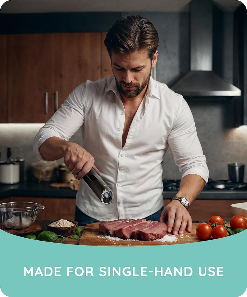 𝐄𝐅𝐅𝐎𝐑𝐓𝐋𝐄𝐒𝐒 𝐎𝐍𝐄-𝐇𝐀𝐍𝐃 𝐎𝐏𝐄𝐑𝐀𝐓𝐈𝐎𝐍: Say goodbye to manual grinding! Our Electric Pepper Grinder offers easy one-handed operation. Simply tilt to automatically grind, allowing you to season your dishes effortlessly.