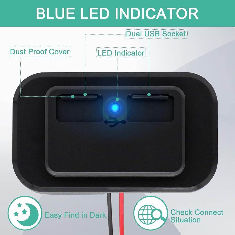 No Need to Drill Large Holes - It's surface mount installation. The device can be installed on a flat surface, with no need to cut a huge hole, just a small hole to put the wire in and never see the wires again, easy to be installed within 15 minutes. Universally suitable for most 12Volt/24Volt Vehicles, Cars, Motorcycles, Boats, RV. Input: 12V-24V, Output: 5V , the blue light is always on when power is on.