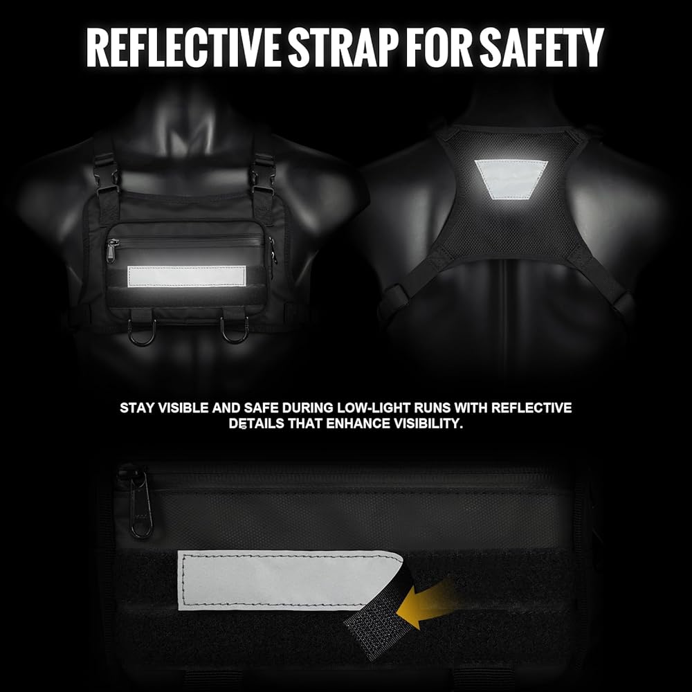 NIGHT SAFETY: Reflective Material used on the front of the chest pack and backside, The front reflective strip is removable. It's safety for lots of runners like running at nights.
