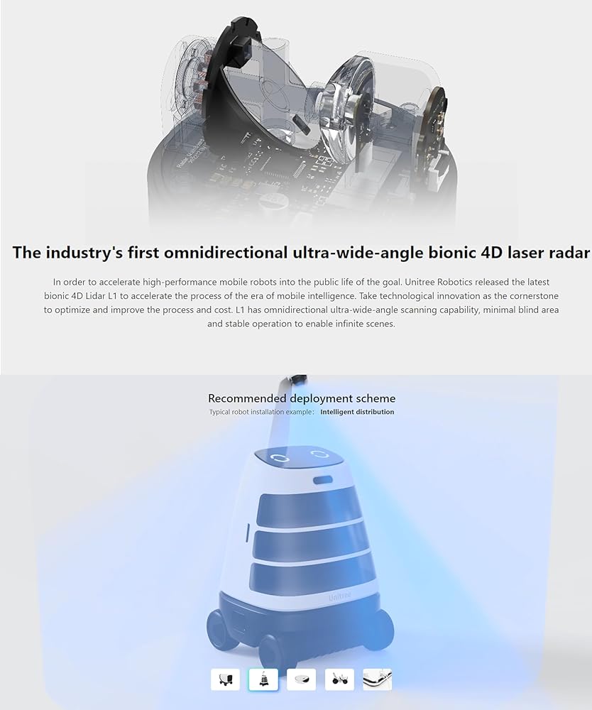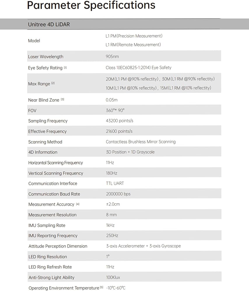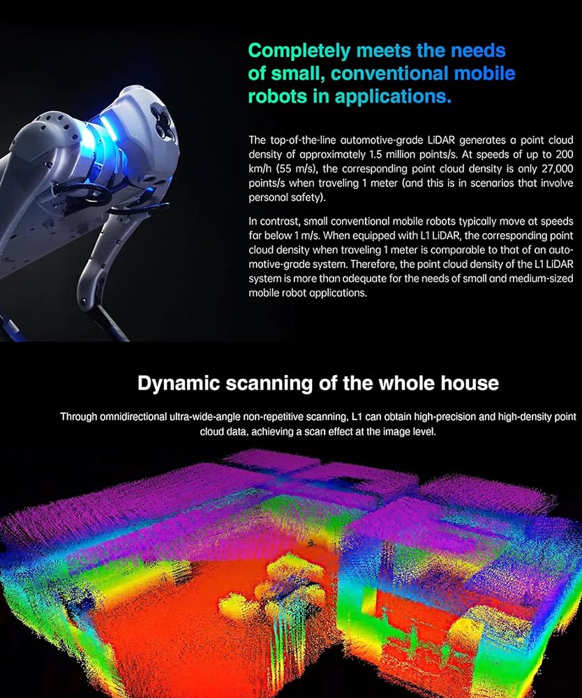 [Hight Performance] L1RM 4D lidar has built-in 3-axis acceleration and 3-axis gyroscope IMU modules, supporting a push frequency of 250Hz. The circumferential scanning frequency of L1 is 11Hz, the vertical scanning frequency is 180Hz, and the effective sampling frequency is 21600 points/ Second. L1 not only has excellent performance, but also has high reliability. It can also achieve stable ranging and high-precision mapping under the strong light of 100K lux outdoors.