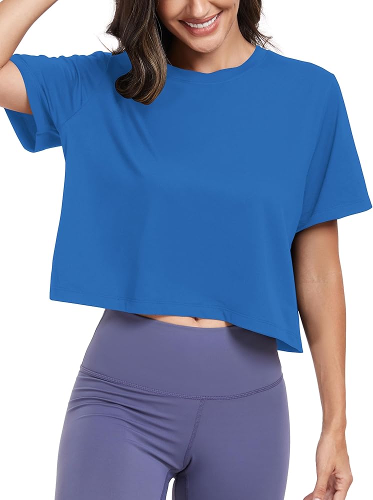 Loose Fit Workout Crop Tops for Women:Cropped Length,Cut right above the waist, which is not too short or too long and looks flattering enough. Perfect with high waisted leggings, shorts, pants or jeans.