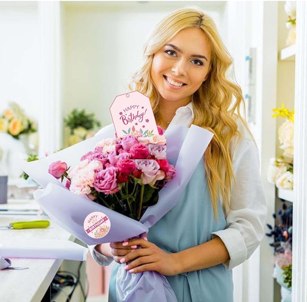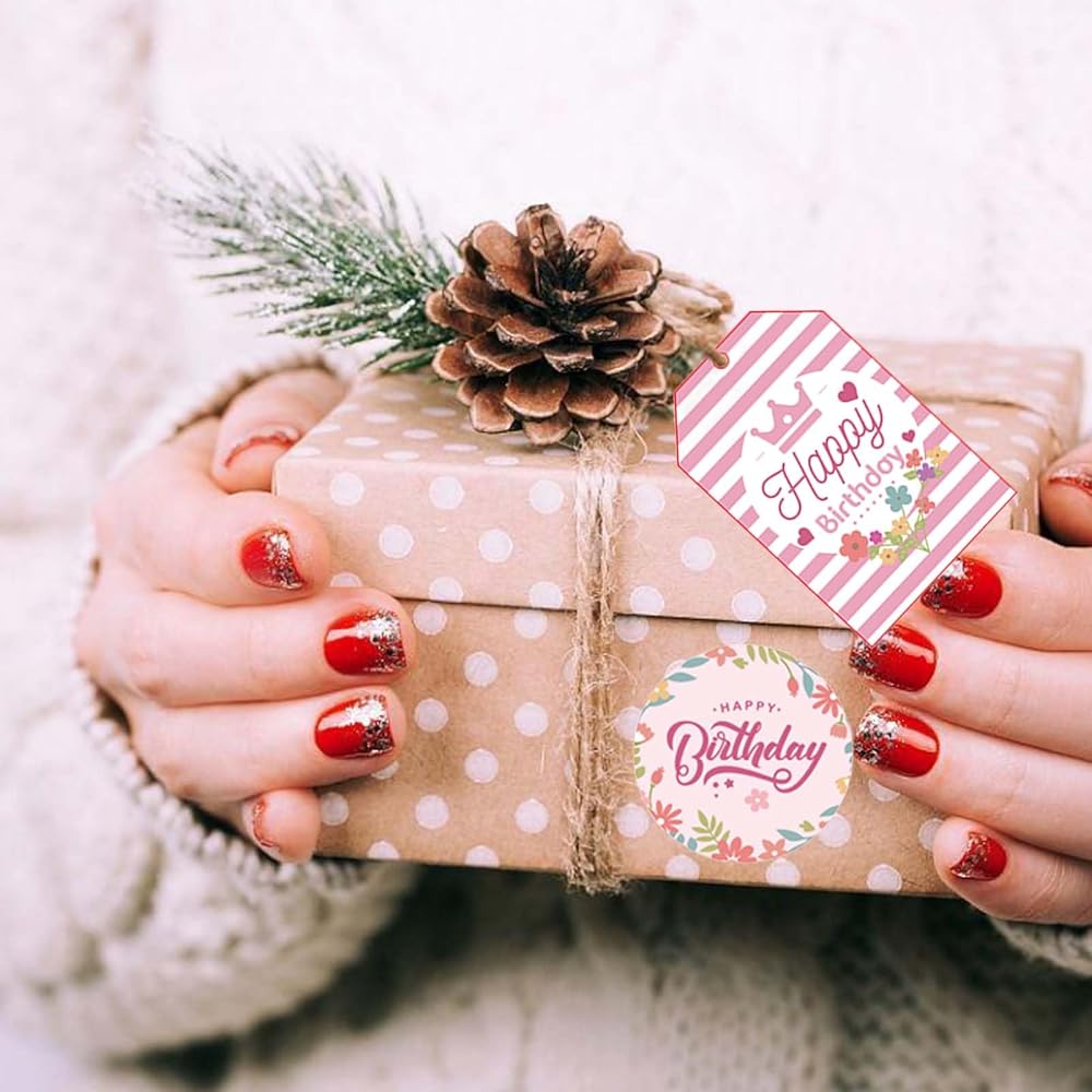 Happy Birthday Tags with String, 100PCS Floral Hanging Labels 500PCS 1.5" Adhesive Labels for Happy Birthday Business Personal Decorative Gift Wrapping