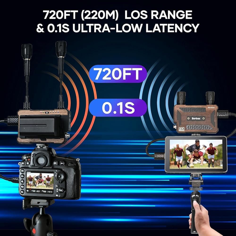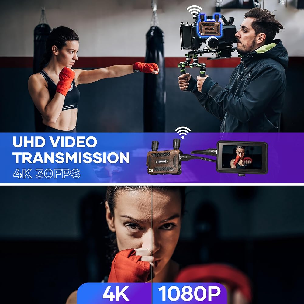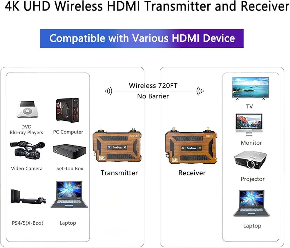 😊【True 4K Transmitter and Receiver】BovBox 4K Wireless Transmitter supports video input/output formats up to 3840x2160@30fps resolution. It also supports video input/output formats 1080P/720P. Adopting H264 encoding, it can achieve 8-20Mbps bit-rate under HD/Balance/Speed Scene Modes