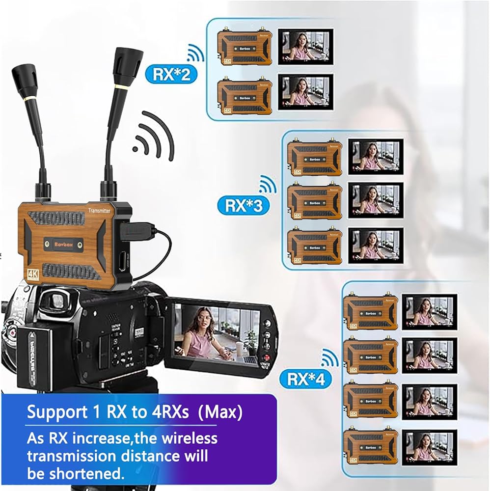 😊【Supports Up to 1TX to 4RXs(Max)】With the Wireless Video Transmission Systems, allows you have up to four receivers bound to one transmitter. As RX increase, the wireless transmission distance will be shortened. 1 TX to 1RX up to 720FT;1 TX to 2RXs up to 330FT;1 TX to 3RXs up to165FT; 1 TX to 4RXs up to 65FT