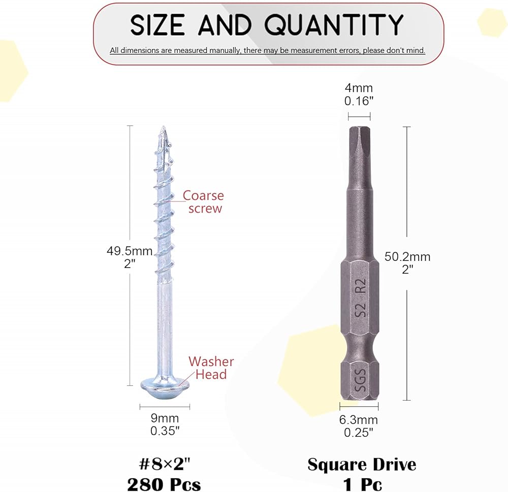 ✅[STANDARD SQUARE GROOVE&CLEAR THREAD] Thread clear, deep thread, uniform force, sharper screw teeth and it is not easy to slip during operation. We include a square drive and with that, not slippery during operation. Without burr, zinc bright surface, corrosion resistance and rust prevention. The overall finish is nice and neat.