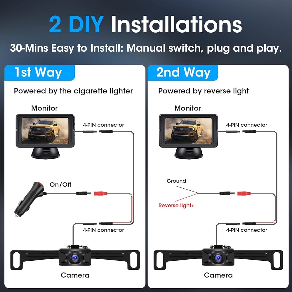 ➤【2 Methods to Install】The backup camera for car can be wired directly to the provided cigarette lighter unit that has an on/off button to turn on the camera at anytime. It also comes with a second power cable that you can wire in to your reverse light so it comes on only when vehicle is in reverse. Was able to install in just a few minutes. And this is a wired camera so you will never lose the signal, the rear cable length is 23ft long enough to wire any normal car, truck, SUV, etc.