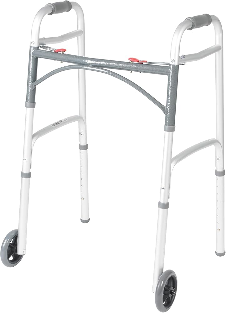 Wheeled Walker: Designed for safety and convenience, this rolling walker features push-button mechanisms that may be operated by fingers, palms, or even the side of the hand