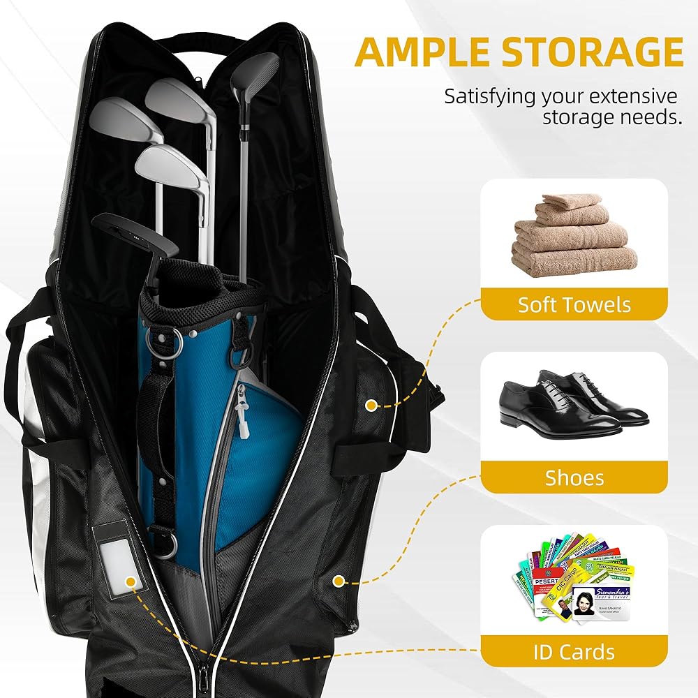 Portable design: With comfy handles, shoulder straps that feel like a hug, and wheels that glide effortlessly, our golf travel bag is your on-the-go travel companion. Bid farewell to heavy lifting and welcome swift check-ins at airports