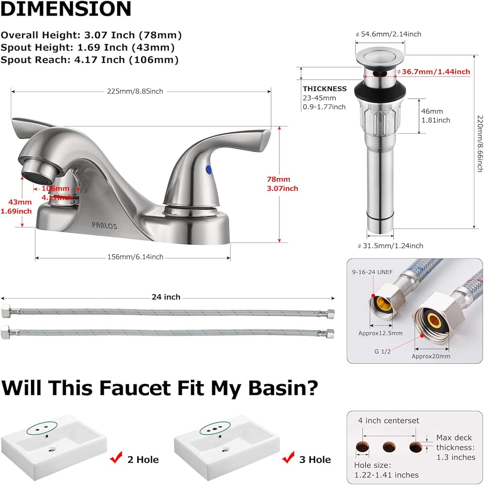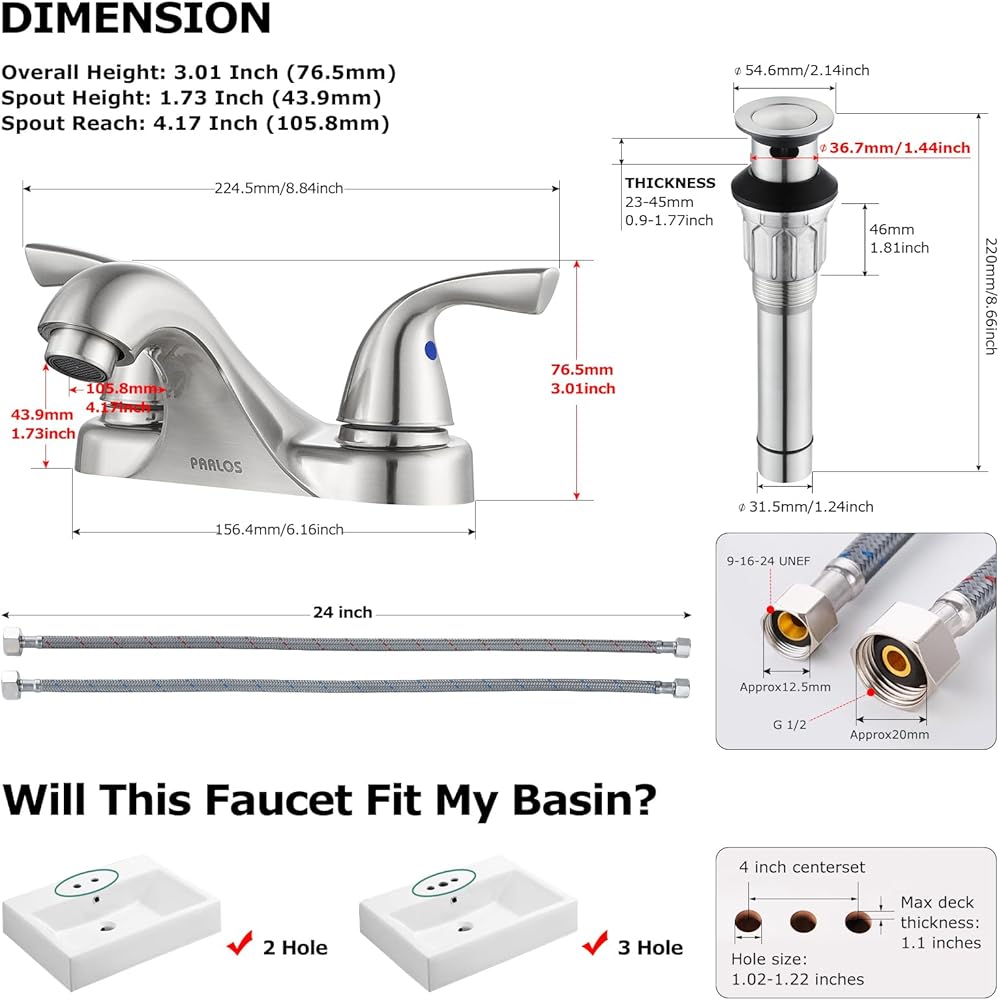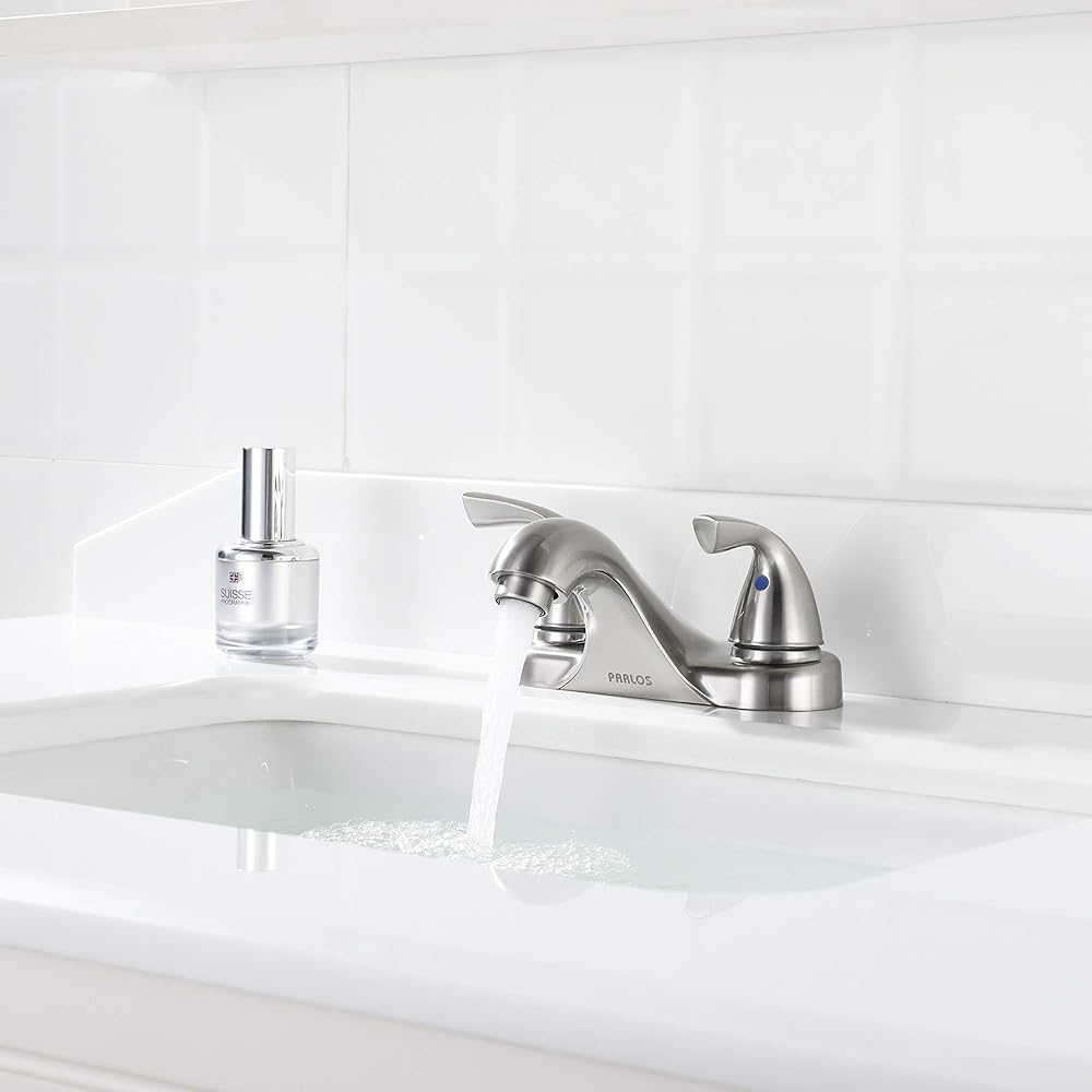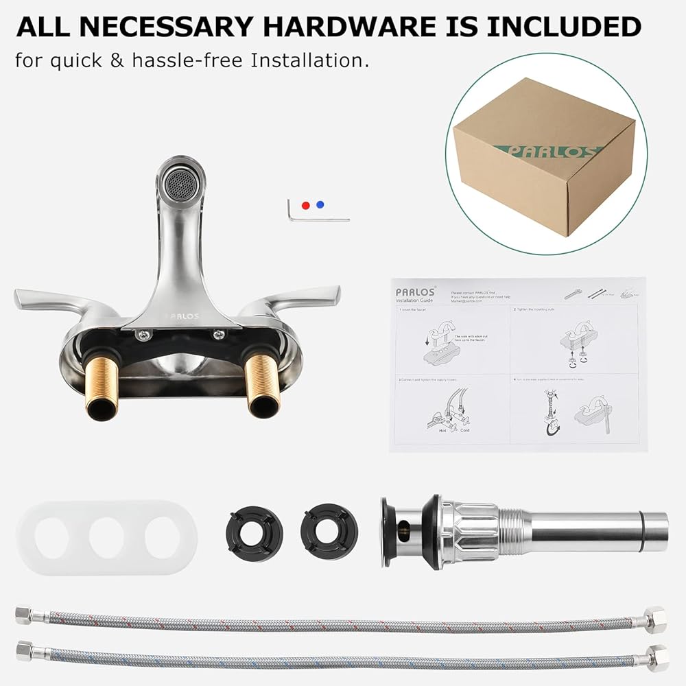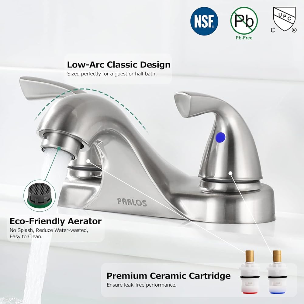 PARLOS Two-Handle Bathroom Sink Faucet with Metal Drain Assembly and Supply Hose, Lead-Free cUPC,Brushed Nickel,13622