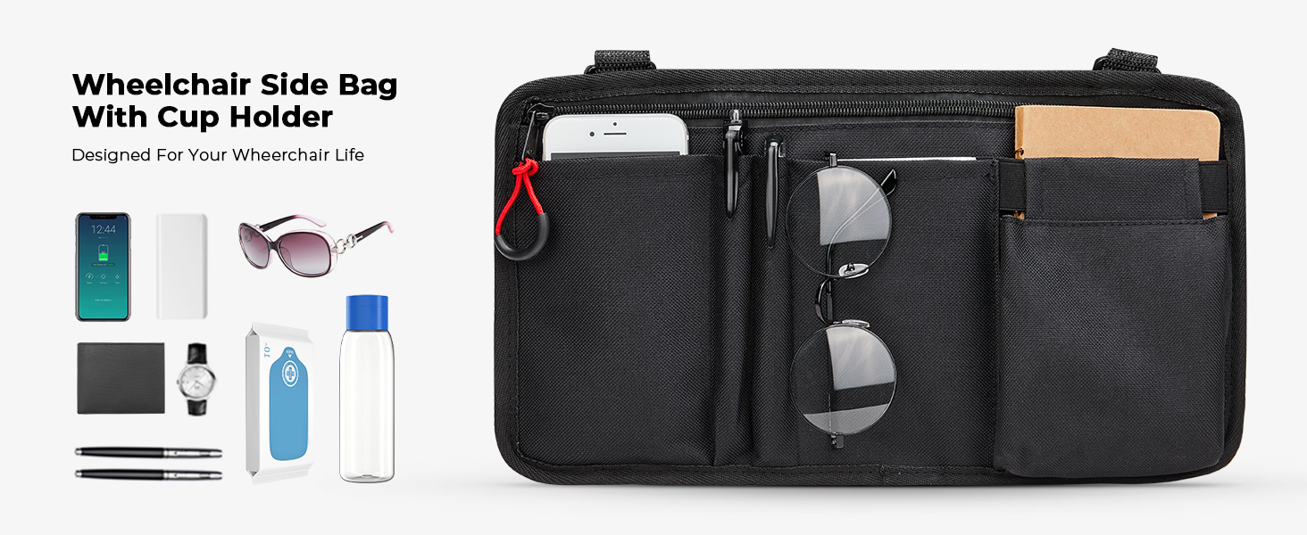 【Multifunctional Wheelchair Bag】Also use as a cup holder this wheelchair bag, pocket with elastic band that you can put bottle straight. Don't worry about the spills.
