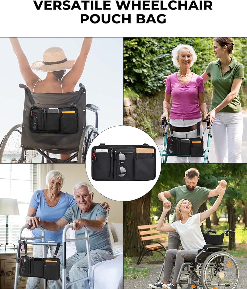 【Wheelchair Accessories Size】Full bag size of wheelchair side bag is 14.2 × 7.5 inch, with 5 front pockets, great for carrying some small item like phone, wallet, pen, snacks, medication, glasses case and other essentials.
