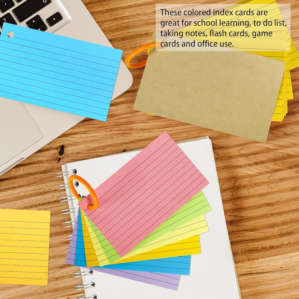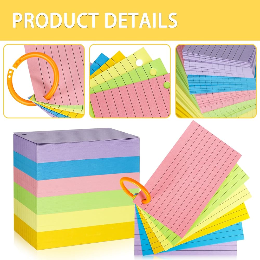 BIGNC 600 PCS Color Index Cards 3 x 5, Flash Cards with Rings, Lined Notecards Study Cards Punched for Learning and Office Supplies, 6 Colors (Lined with Rings)