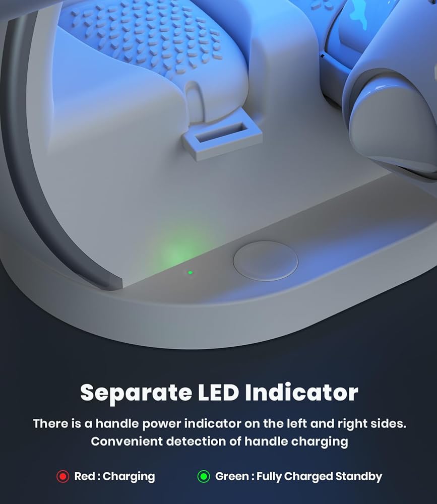 ⚡【With Indicator Light】-- Our VR Charging Dock has designed LED lights to indicate the charging status of the controller. The Red light means it is charging, and the Green light means fully charged. It's easy to tell when your devices are charging or charged.
