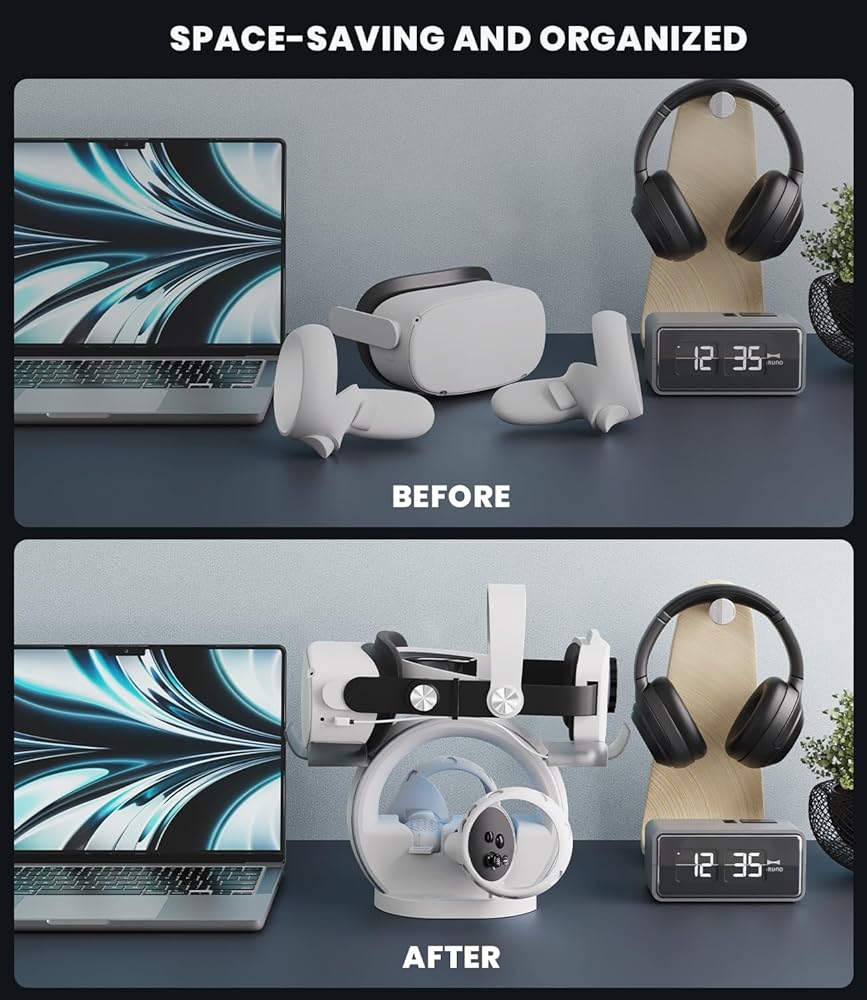 ⚡【Perfectly fit for Elite Strap with Battery】-- Upgraded VR stand is specially designed for displaying and storing your VR headset. Fit for Elite Strap with Battery. With a unique frosted non-slip design and a strong textured base, it is safe and stable to place your VR headset strap and controllers.
