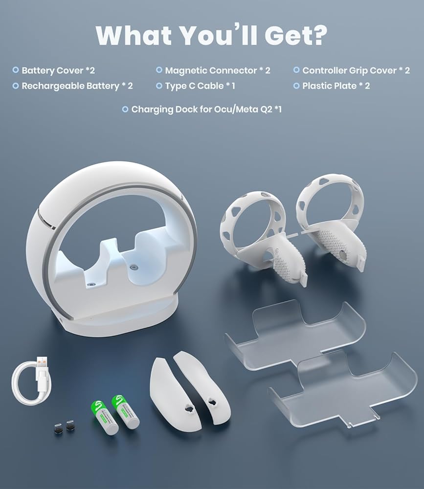 ⚡【You Will Get】-- 1 x Oculus Quest Charging dock, 1 x USB-C Link Cable, 2 x 2600 mWh Rechargeable Controller Batteries, 2 x Custom Controller Covers, 2 x Magnetic Charging Head, 1 x User Manual, 2 x VR silicone grips.
