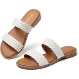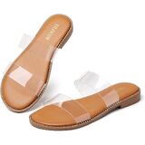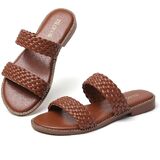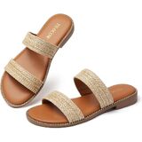 【Stylish Design】Featuring two strap design, and the brown insole is surrounded by metal rivets, multi color to choose from, these open toe flat sandals add charm to your summer outfits.