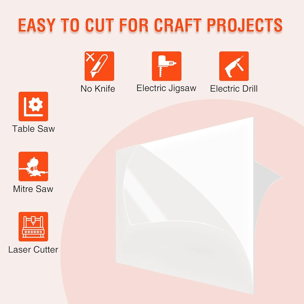 【EASY PROCESSING】 The acrylic plexiglass sheet can be easily cut using a table saw, jigsaw, drill, or laser. The cutting edges will always remain clean and smooth, and even better results can be achieved by using a hot air gun."