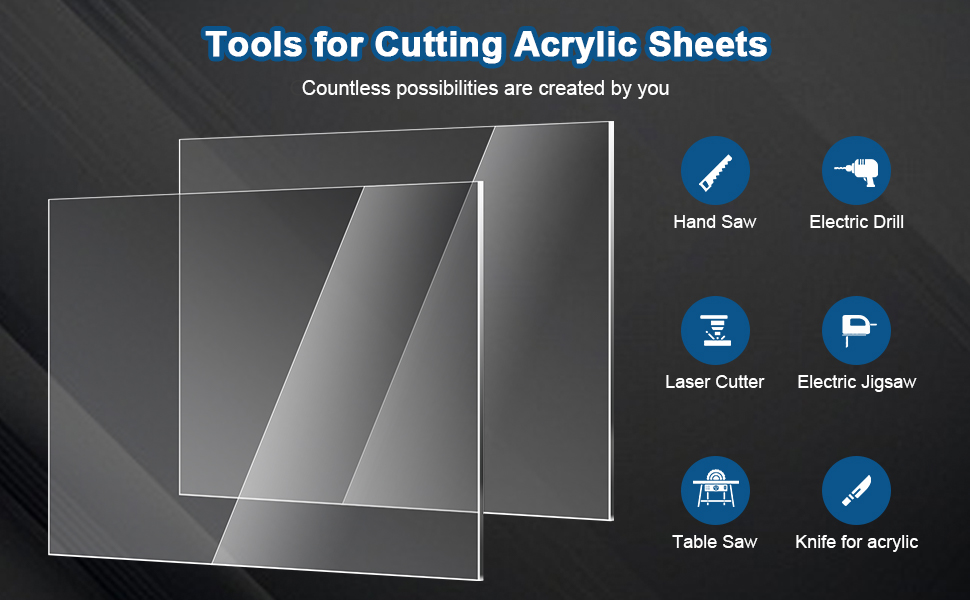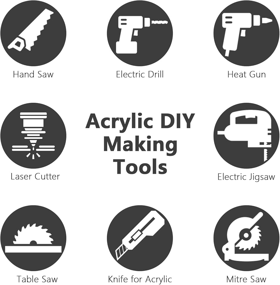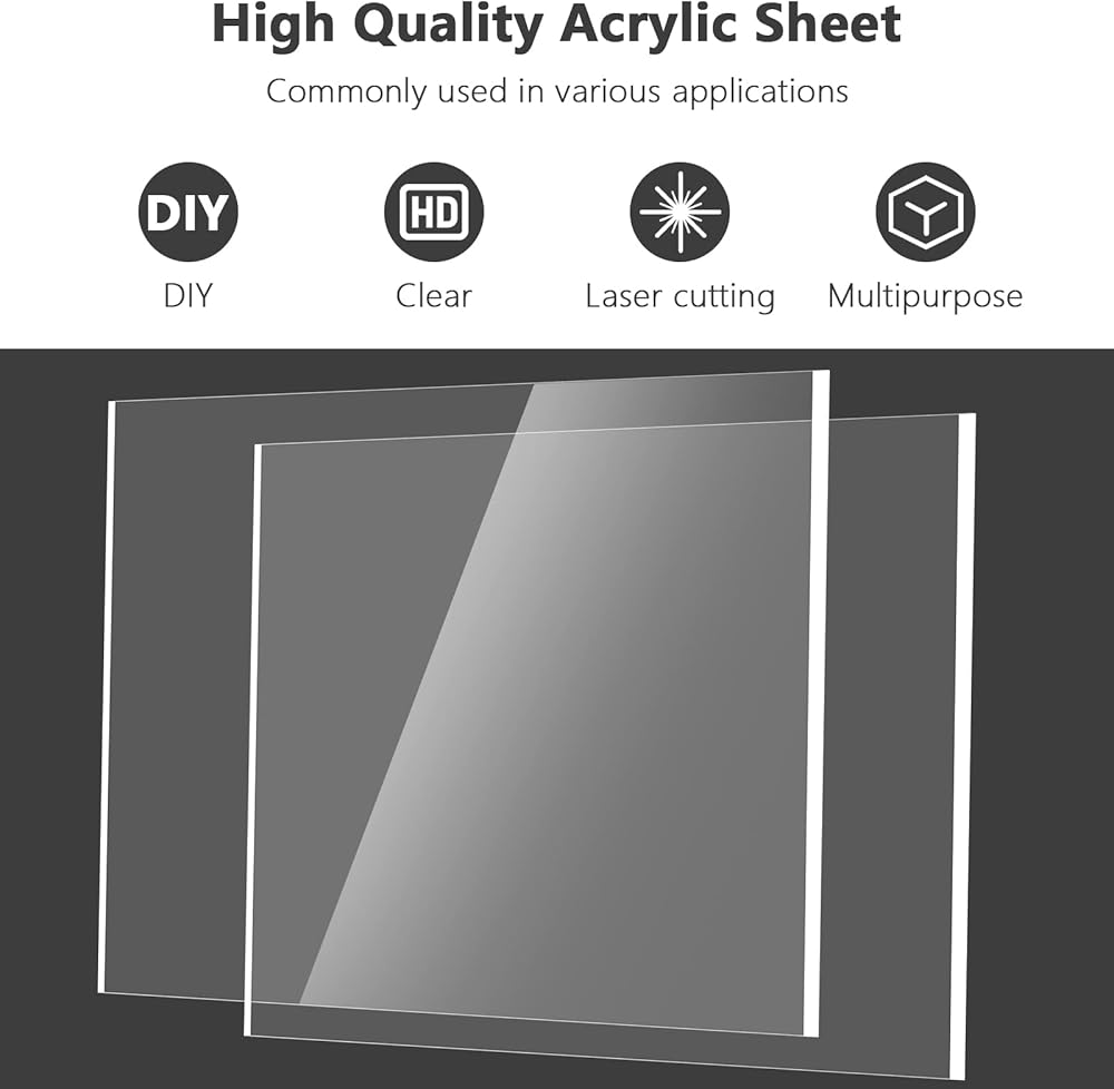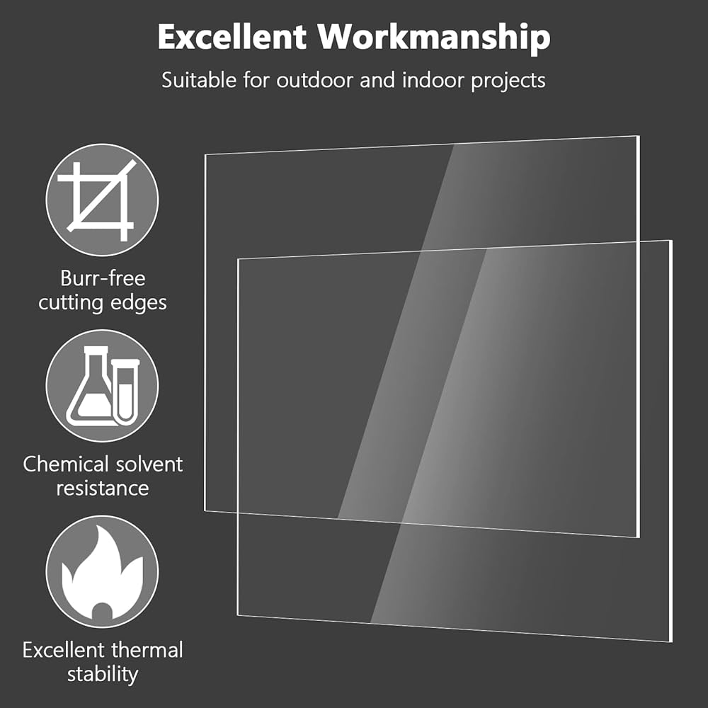【Easy to Cut】Plexi glass sheets can be easily cut, engraved, drilled, and polished with lasers, chainsaws, and hand tools. Cast acrylic sheet has no melting point, so it will not melt or create scorch marks during laser engraving. You can also use miter saws, vertical saws, table saws, or routers to cut the sheet to the desired size and shape