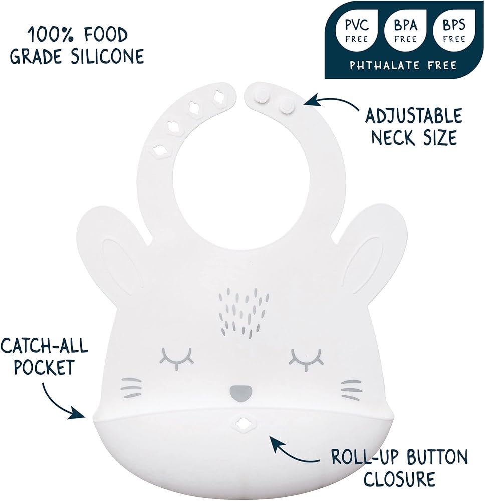 FITS SNUGLY: Our silicone baby bibs feature adjustable neck closure button fasteners for achieving a snug yet comfortable fit. There are 4 adjustment settings parents could select to achieve a good fit for their children. We designed this bib with two buttons to keep it secure in place even if the child energetically moves during mealtime.