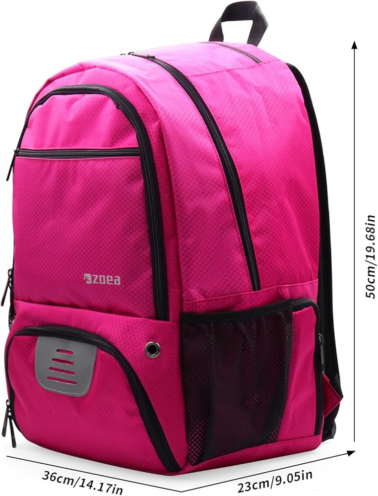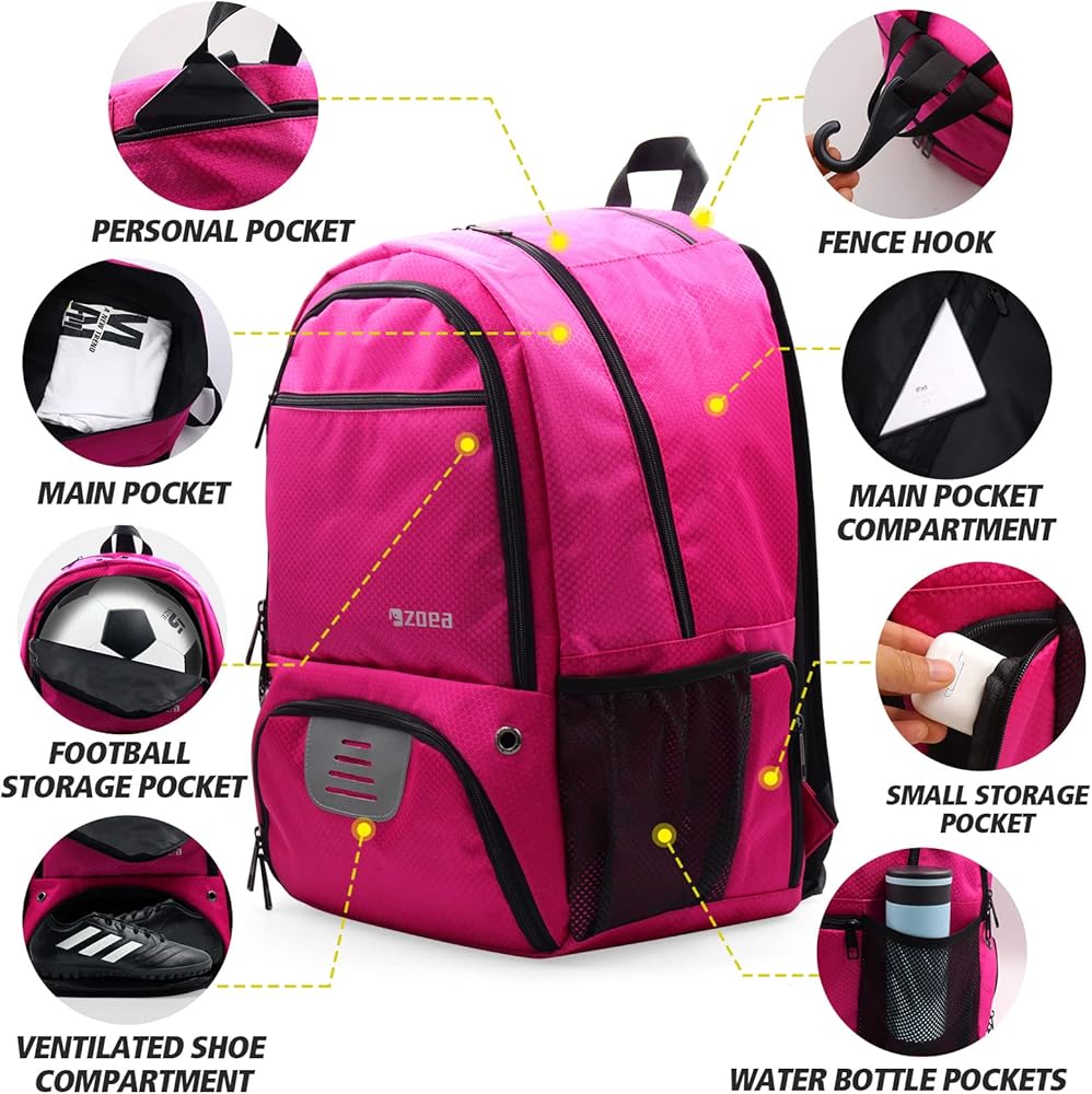 Improved Storage - Soccer backpack has zipper pockets on both sides which can store some snacks kneepad and wristband. There are mesh pockets on each side, used to hold water bottles, umbrellas and leg pads respectively. Holds your smart phones, keys and wallets in the top pocket.Along with a large main storage compartment, the ZOEA Basketball bag backpack has Four extra storage lined shallow pocket for small items.