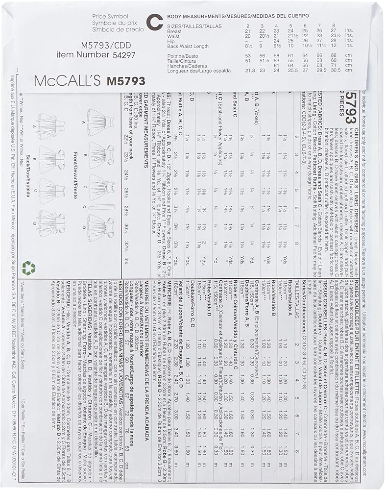 McCall's Patterns M5793 Children's/Girls' Lined Dresses, Size CDD (2-3-4-5)