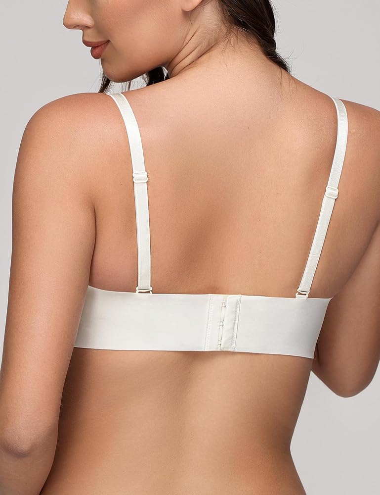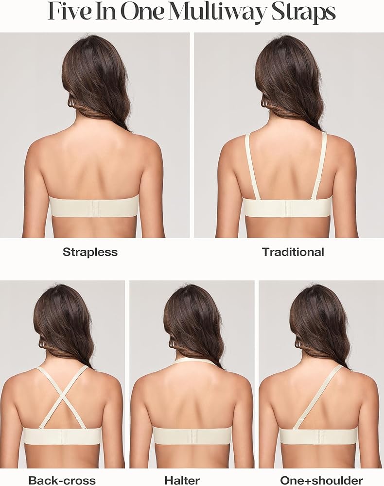 Multi-way bra comes with detachable straps, convertible like traditional, strapless, off shoulder or crisscross.