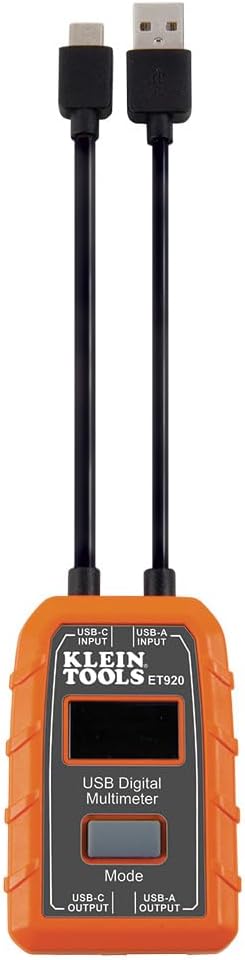 The Klein Tools ET920 is a USB digital meter for Type-A and Type-C ports. It accurately and reliably measures and displays the USB port voltage, current, capacity, energy, and resistance simultaneously. It can function with any USB-A and most USB-C ports, including Qualcomm Quick Charge ports that have the ability to deliver power. It requires NO batteries as it draws power from the power source to function. For more than 160 years, Klein Tools has manufactured premium-quality, professional-grade hand tools that deliver the performance, durability and precision needed to get the job done right. Our family of engineers, workers and craftsman continue to put six generations of expertise into every tool we create by using only the highest quality materials, superior workmanship, and keeping manufacturing as close to home as we can. Klein isn't just the name of our company, it's also our family name. And since we're an American company that's family-owned and family-run, you know you can count on us to be here tomorrow. Klein Tools doesn't just make great products, we make great products that stand up to the demands of the professionals who use them every day ... Since 1857.