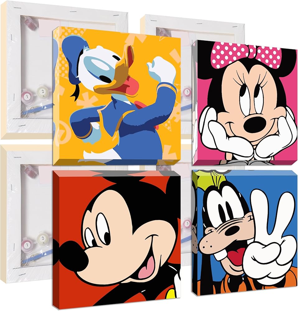 Framed Paint by Numbers for Kids - 4Pack Cartoon Paint by Numbers for Kids Ages 4-8-12, Mickey Paint by Number Kits on Canvas, DIY Oil Painting Acrylic Kits Paint by Numbers for Home 8x8in