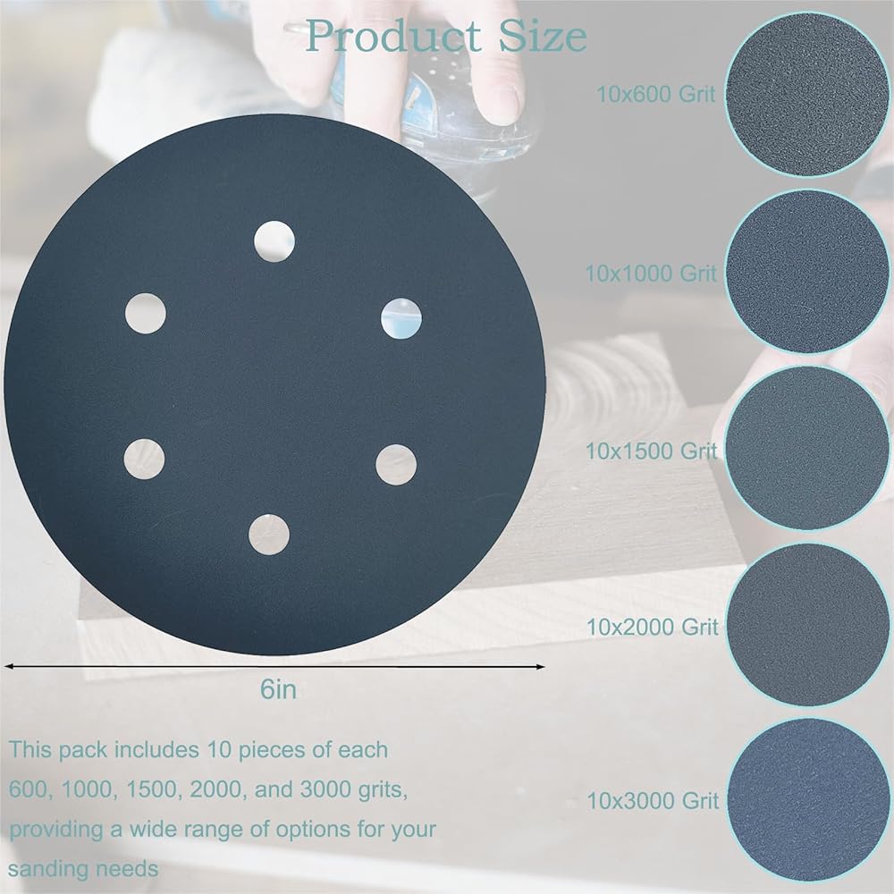6 Inch 6 Hole Silicon Carbide Sanding Disc Kit - 10 Each of 600, 1000, 1500, 2000, 3000 Grits, 6" Hook & Loop Backing Wet Dry Sandpaper for Automotive Woodworking DA Orbital Sander
