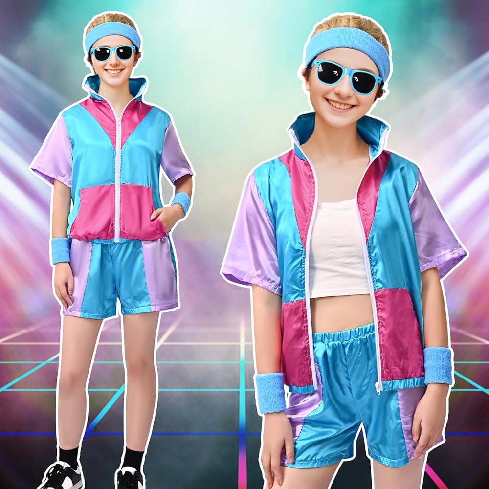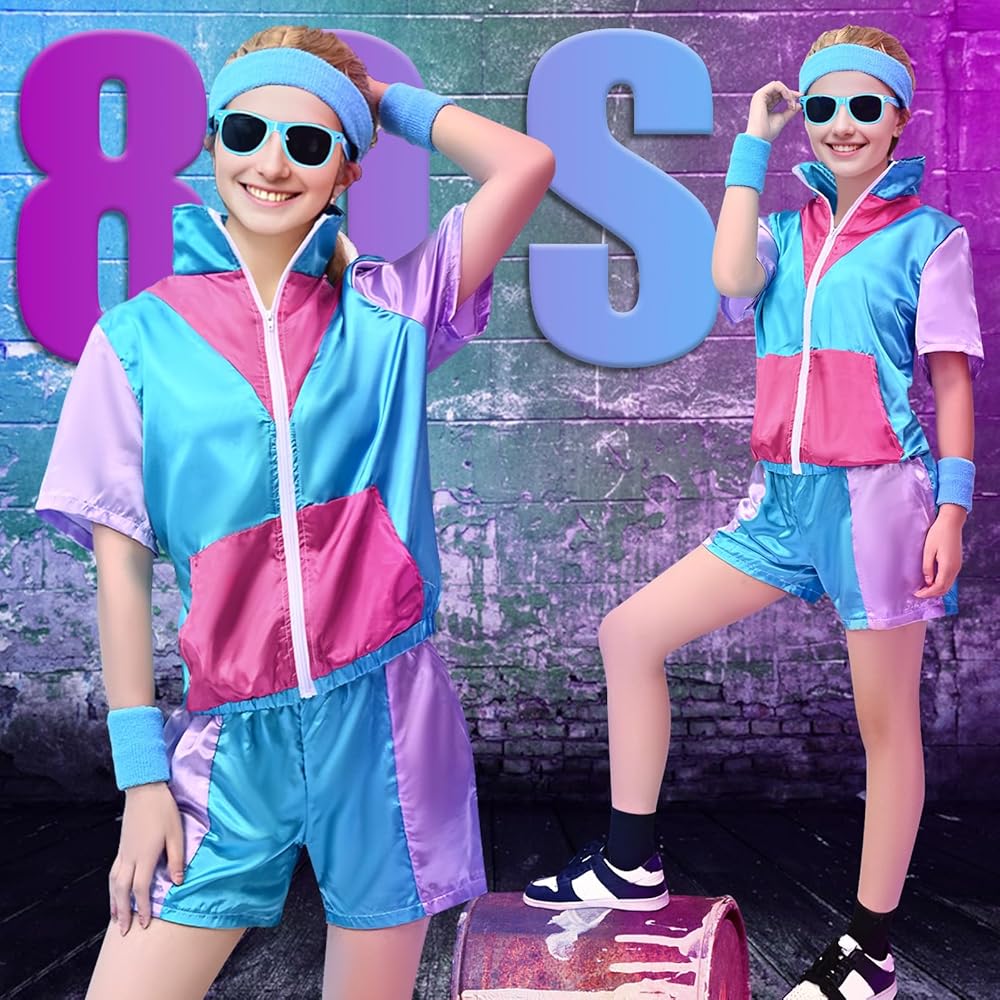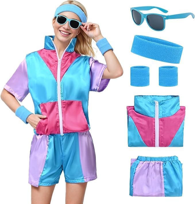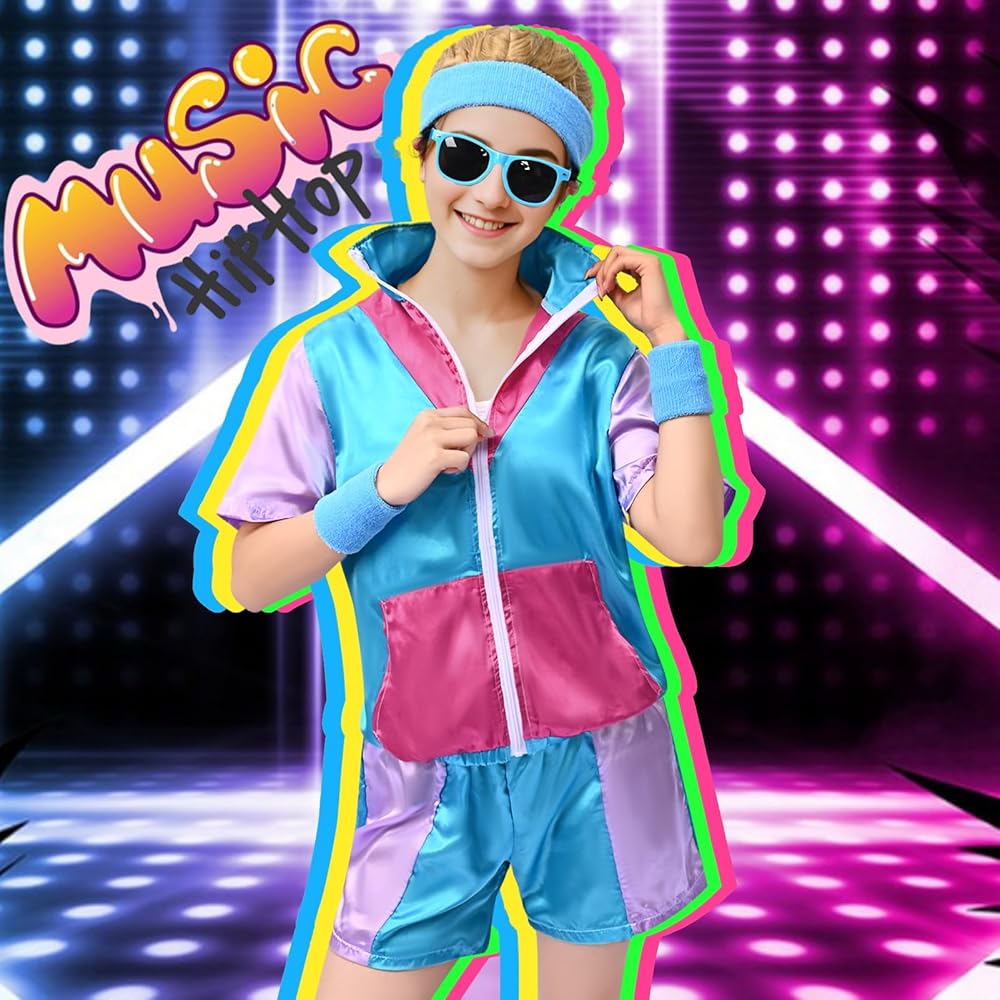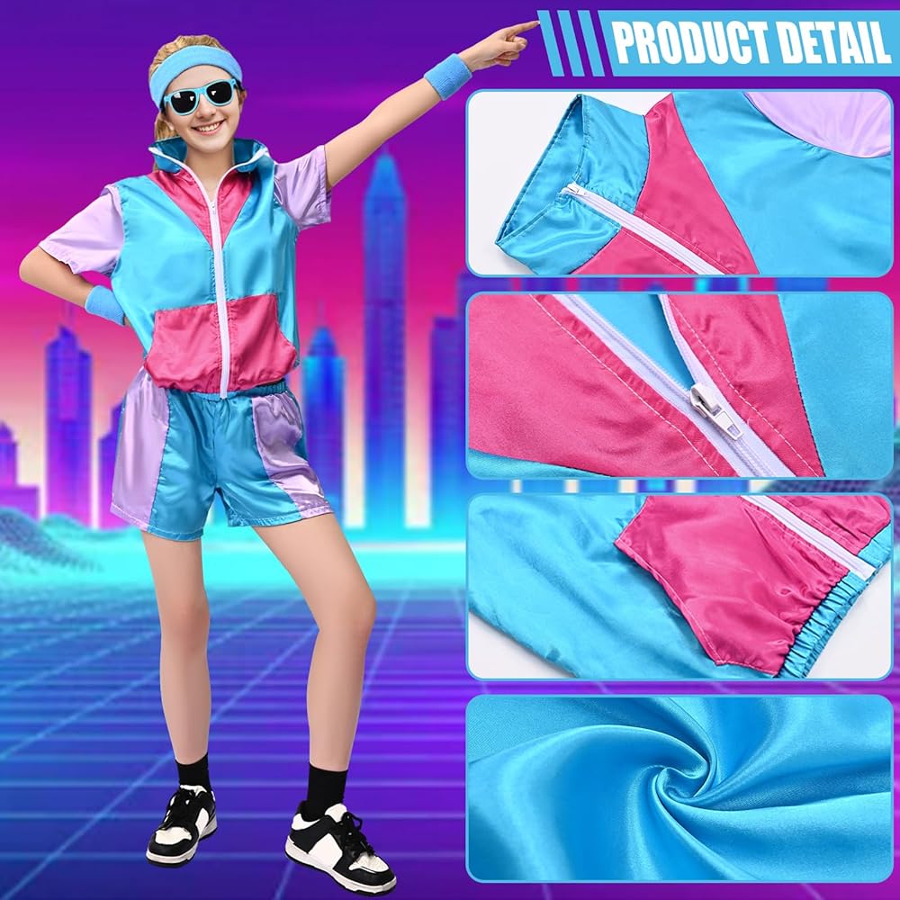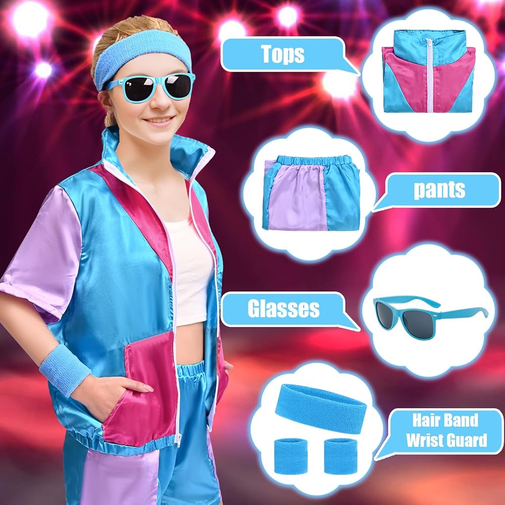 [80s Sportswear Set]: This 80s tracksuit women set includes 6 pieces: Our 1*retro short windbreaker jacket + 1*pants + 1*glasses + sweatbands set(1*headband + 2*wristbands).