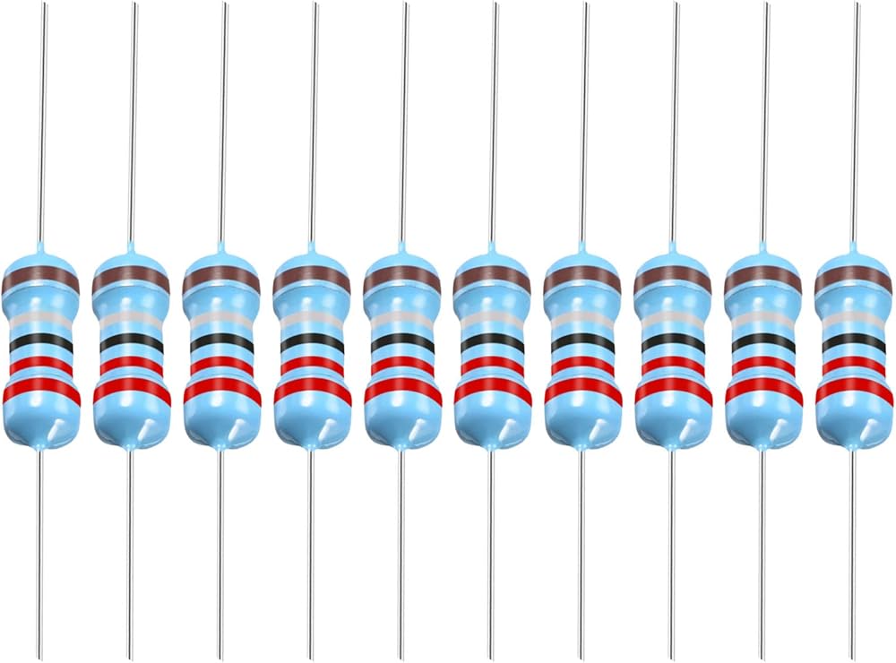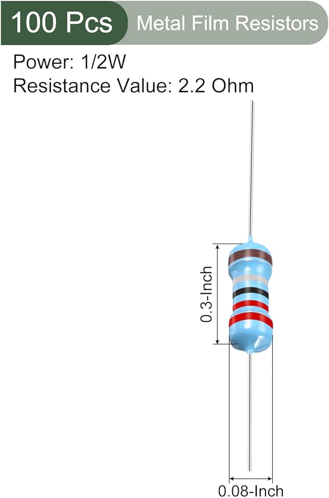 WHAT YOU GET - The package comes with 100pcs metal film resistor that measures Body Size: 8.5 x 3mm / 0.3 x 0.12-inch (L*D); Body Length:8.5mm±1mm; Power: 1/2W; Tolerances: ±1%; Resistance: 2.2 Ohm; Color Code: Brown, Black, Black, Brown, Brown.