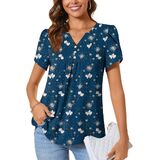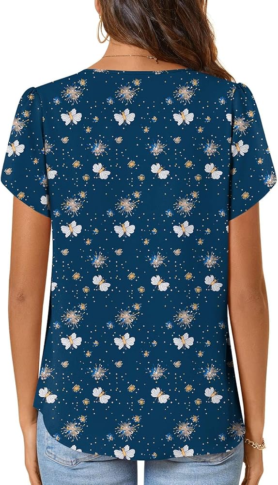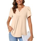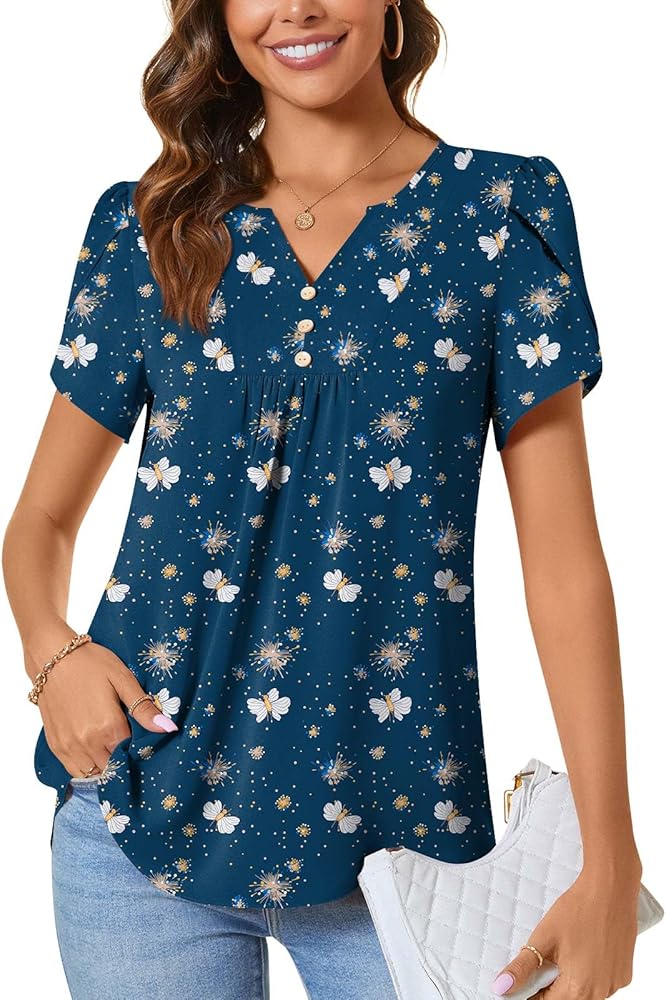 السمات: قمصان نسائية بأكمام قصيرة بتلات، تصميم لطيف برقبة على شكل حرف V، مقاومة جيدة للتآكل، أقل عرضة للوبر والتجاعيد، مريحة ولكنها أنيقة.