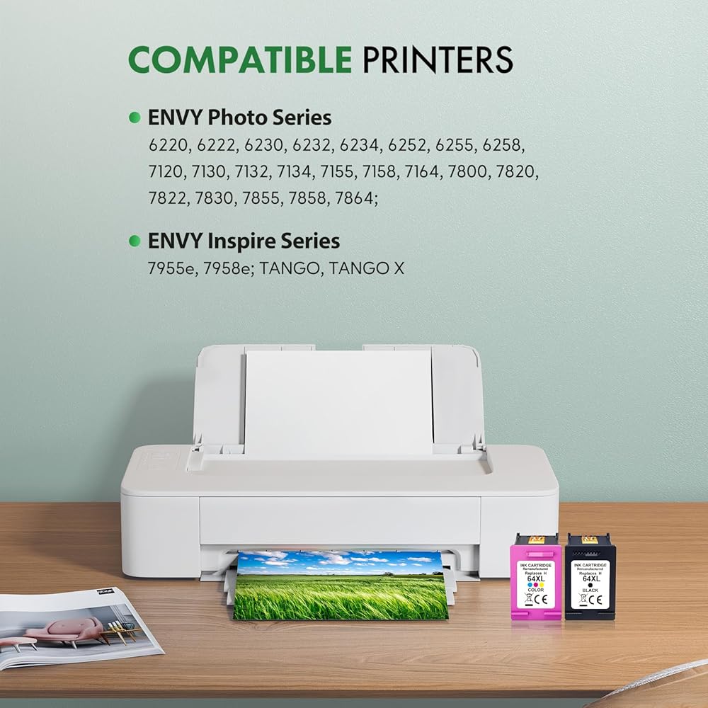 64XL Ink Cartridges Combo Pack Compatible for HP 64 XL Remanufactured for HP Envy Photo 7855 7858 7155 6255 6252 7100 7800, HP Envy Inspire 7900e 7950e Tango Series Printer (1 Black, 1 Tri-Color)