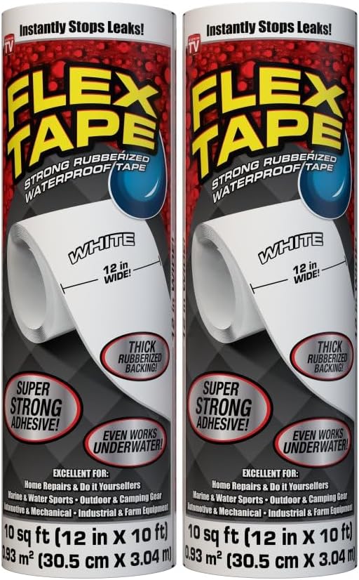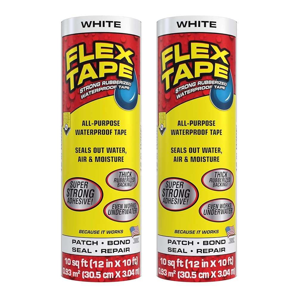 Flex Tape, Original Thick Flexible Rubberized Waterproof Tape - Seal and Patch Leaks, Works Underwater, Indoor Outdoor - Home RV Roof Plumbing and Pool Repairs, White, 12 in x 10 ft, Pack of 2