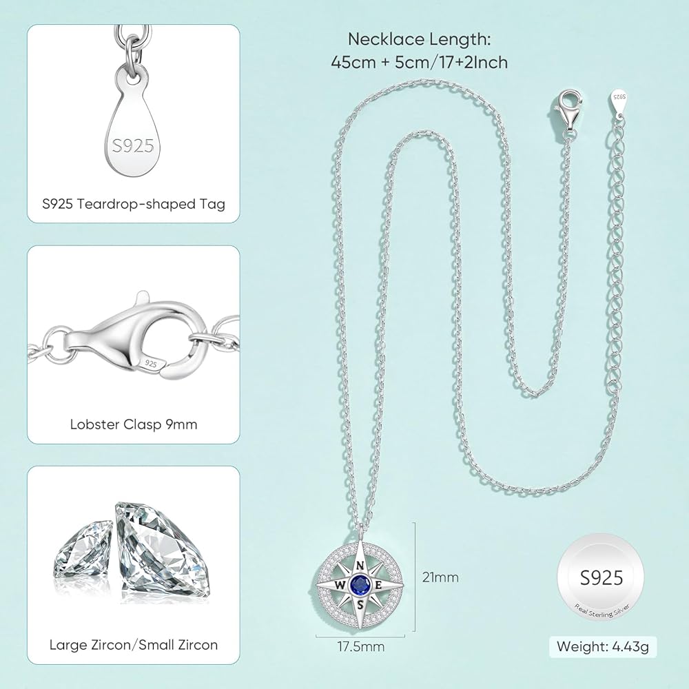 【925 Sterling Silver Necklace】Everything is S925 sterling silver including the chain, the pendant and the clasp. We sell real S925 products, and compass pendant necklace withstands any kind of S925 test. The pendant is embedded with a zircon oxide stone, adding fashion to the necklace.