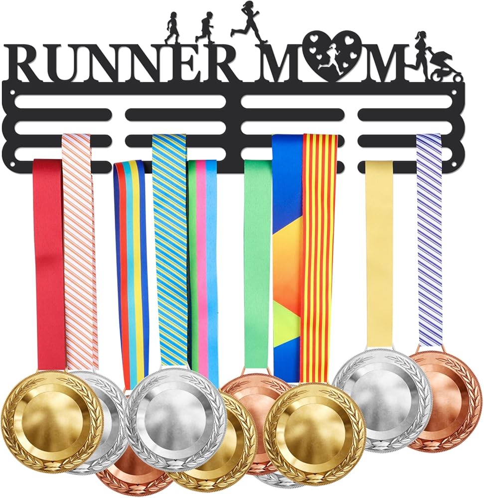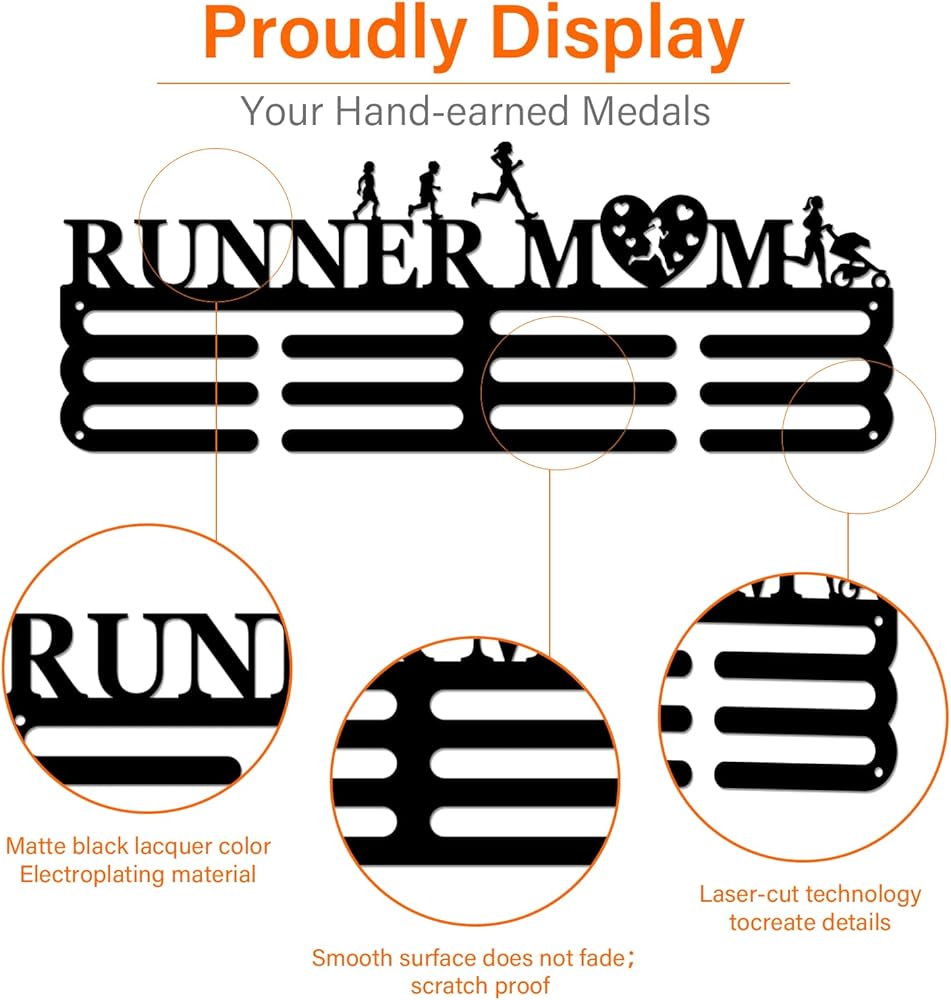 Runner Medal Hanger: The sports medal holder is designed for running sports with design of “Runner” and 5 running people, can be used for hanging marathon running competition medals and ribbons.