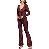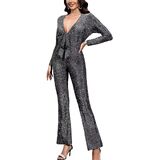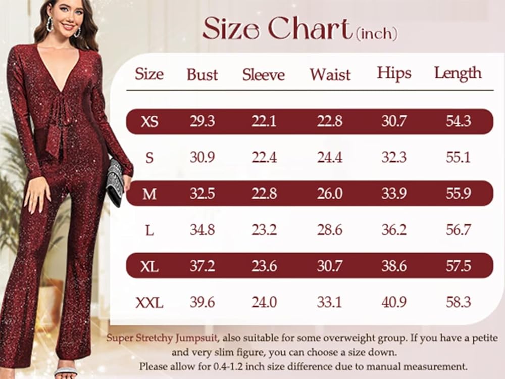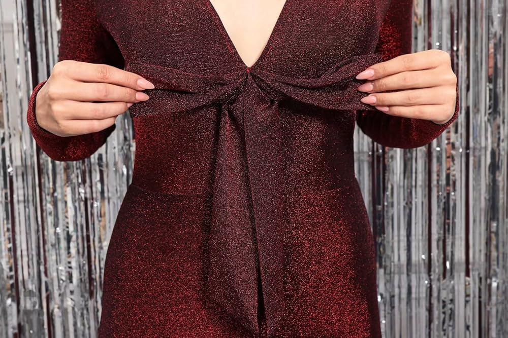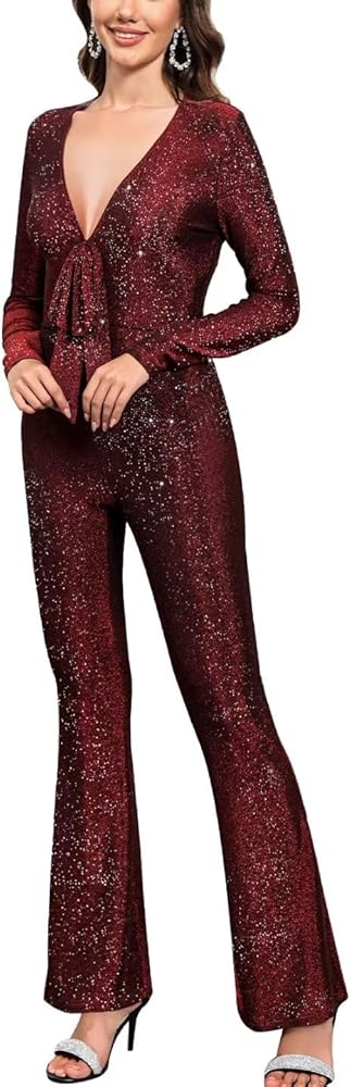 Features: Formal evening jumpsuit for women, glitter sparkly shiny jumpsuit woman, long sleeve, deep V neck Jumpsuits, front tie decoration (can cover the thick waist), little flare leg (more elegant and charming), sexy and bodycon pants romper , party evening wedding grown Jumpsuit, 70s disco jumpsuit.( Black looks more formal and casual, wine and silver more sparkly really beautiful and elegant.)