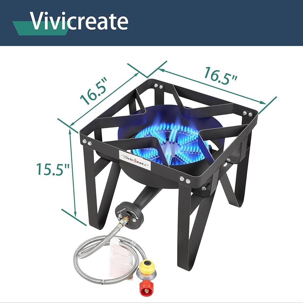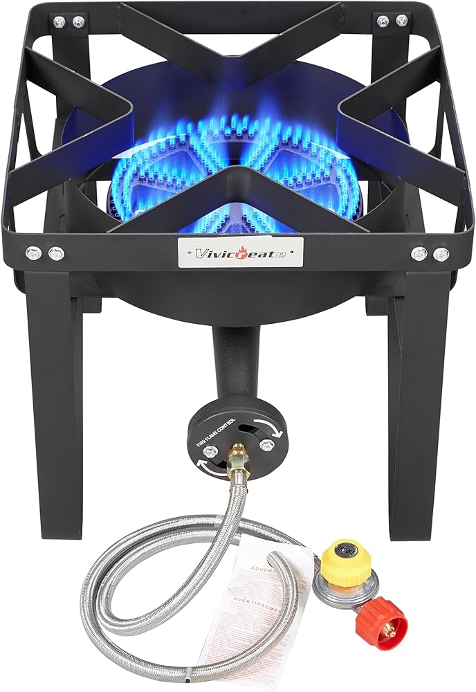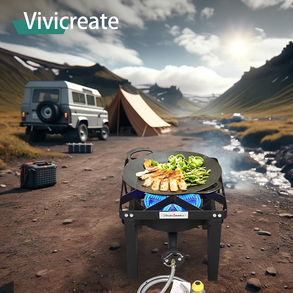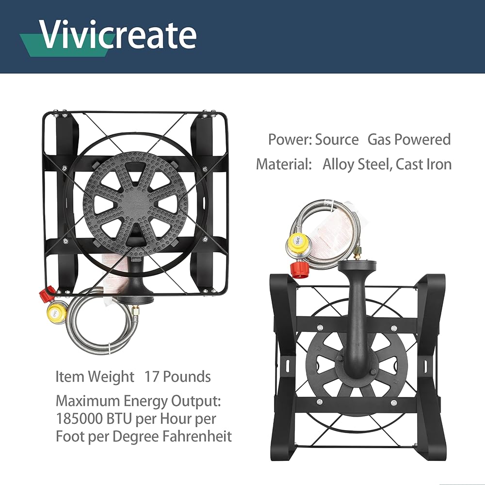 Vivicreate Propane Gas Stove, 185000 BTU High Pressure Outdoor Camping Stove with Regulator, Cast Iron Burner, CSA listed regulator and gas hose,Black (Higher)