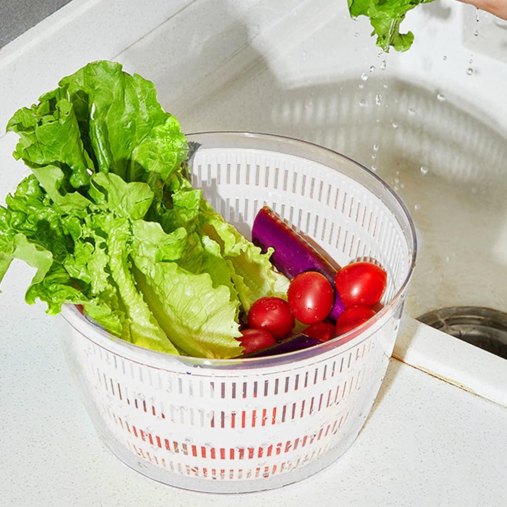 🍅Premium Material:Vegetable and fruit dryer are made of food grade ABS and PP materials,food grade materials are healthier.Salad dryer spinner is easy to assemble and can be taken apart for cleaning.The detachable turntable design ensures barrier-free cleaning and helps keep it clean and tidy. Demonstrating the quality of meticulous craftsmanship. Farewell to frying vegetables and splashing oil, sturdy material, you can use it with confidence.
