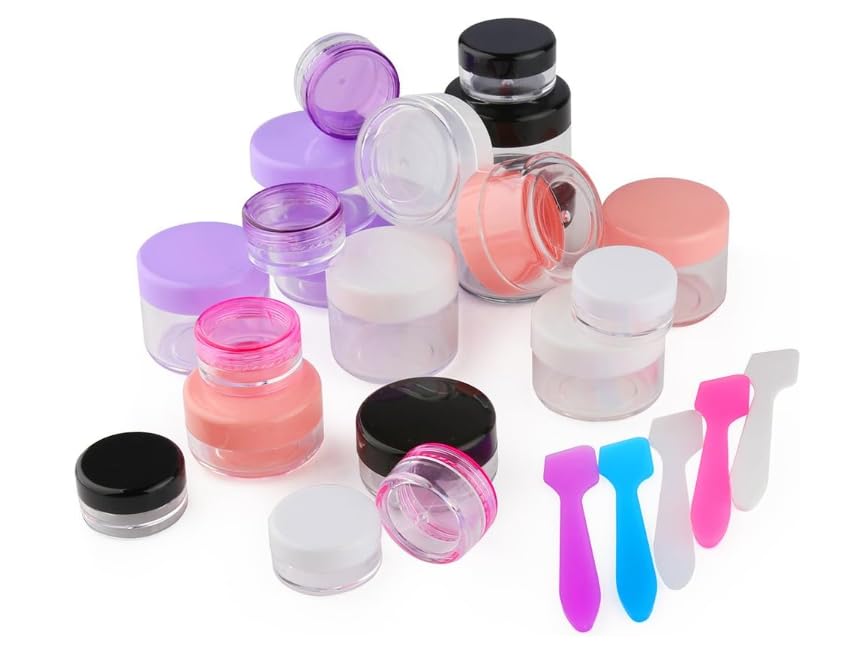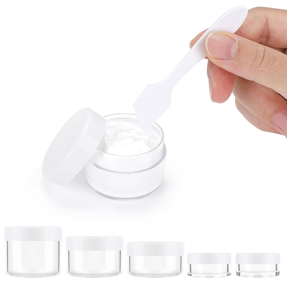 Package includes 10 pieces empty clear plastic sample containers with lids and 5 pieces mini spatulas; Good for traveling.