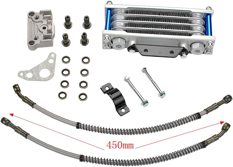 Package Includes:1 radiator , 2 hoses, 1 bracket, 1 cylinder head cap,4 banjo Bolts and washers,Installation Instruction NOT Included,just use bracket to mount on Carb.