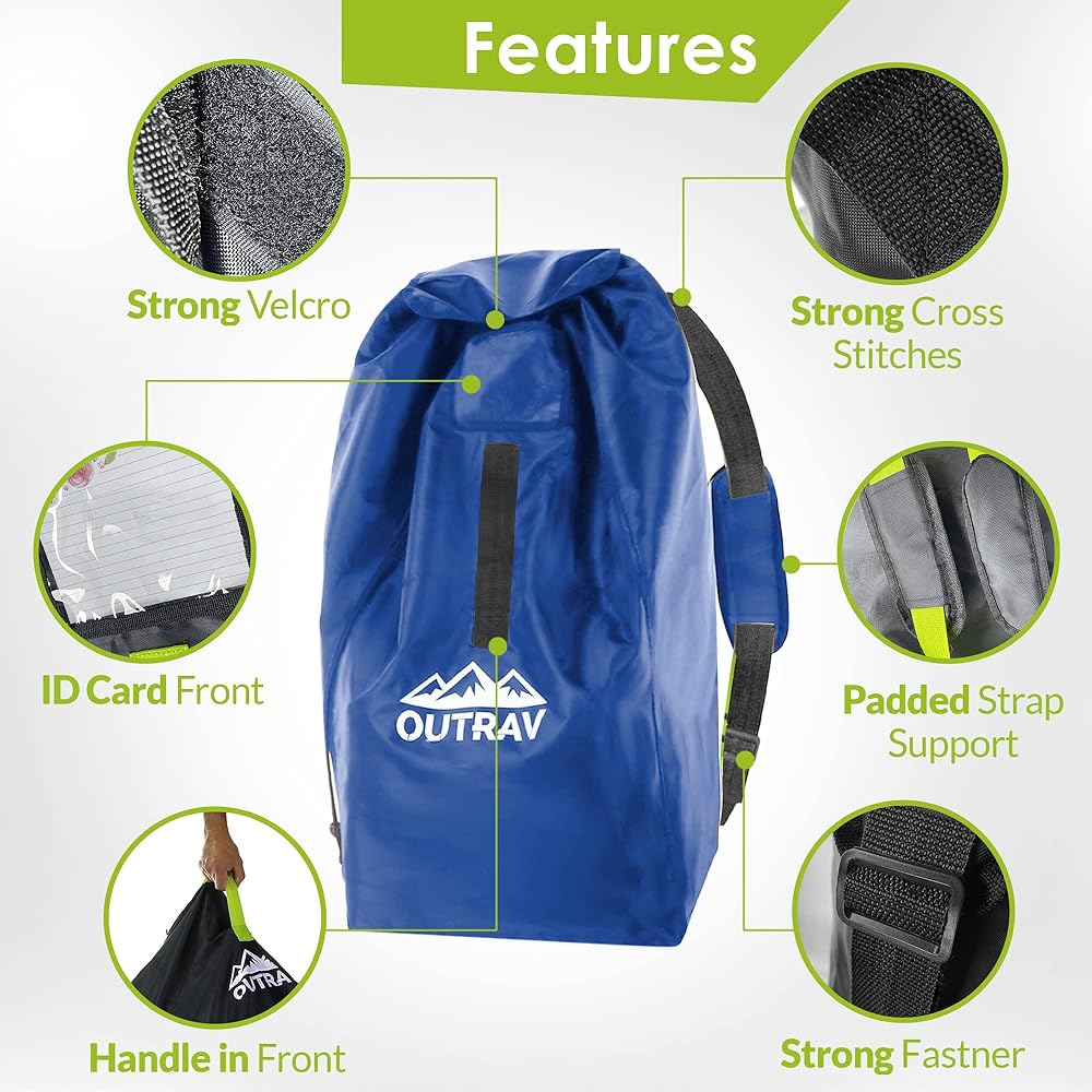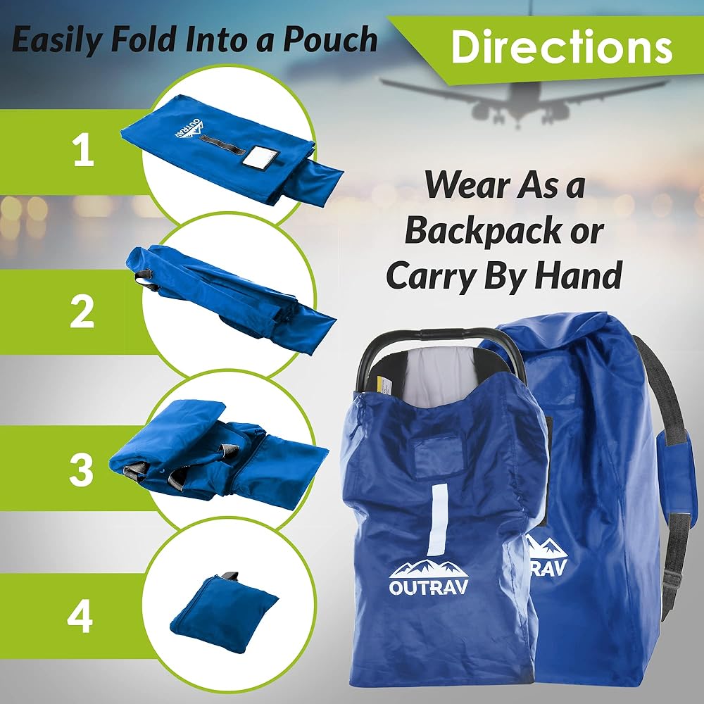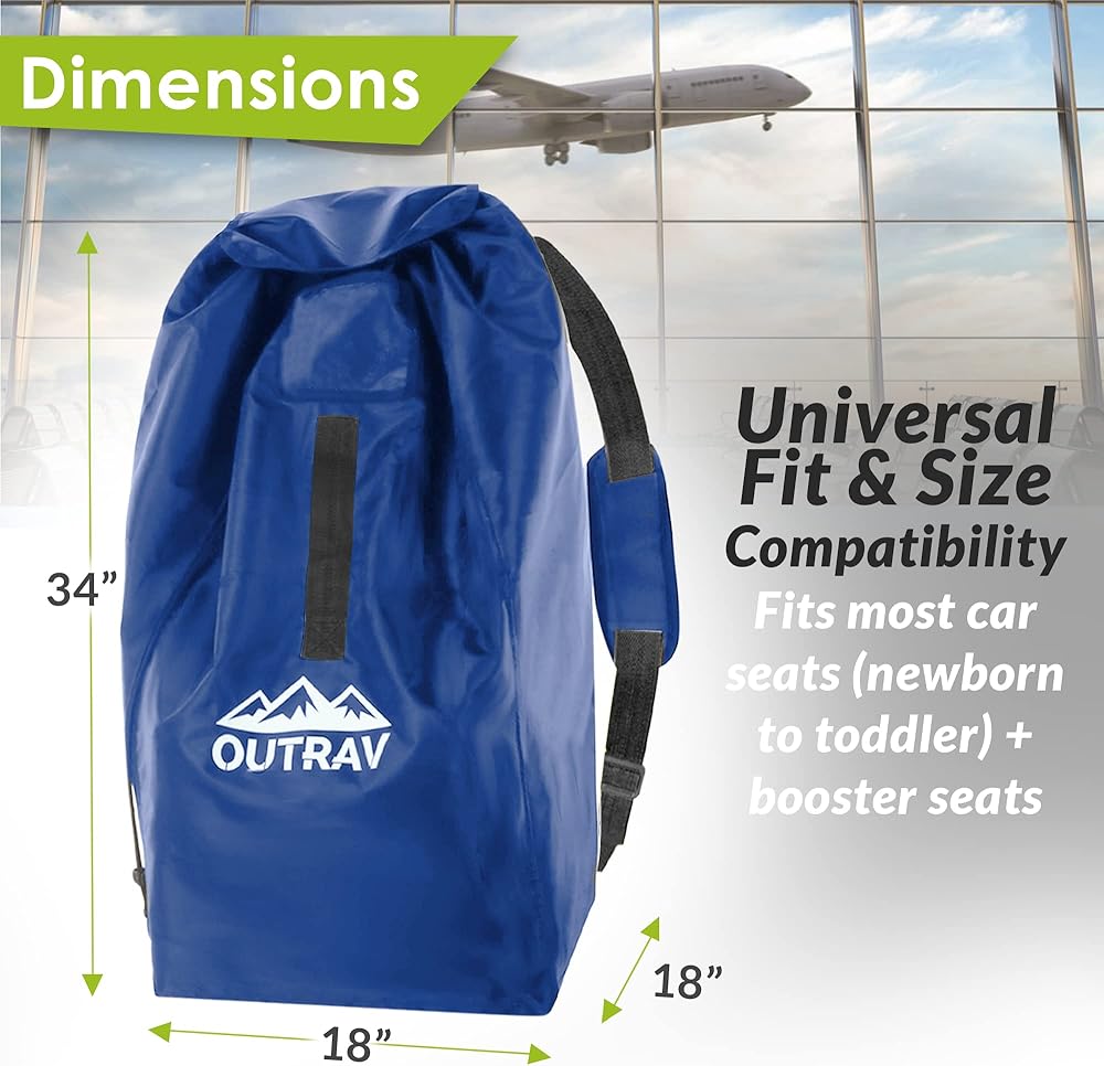 UNIVERSAL STANDARD ONE-SIZE FIT: Outrav's gate check bag for car seats is compatible with most infant car seats & baby booster seats, including models by Evenflo, Graco & Chicco. Measures 34” tall, 18” wide, 18” deep.