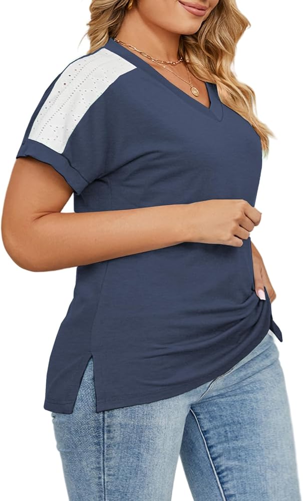 ROSRISS Plus-Size Tops for Women Summer Short Sleeve V Neck Shirts Side Split Tunics XL-5XL